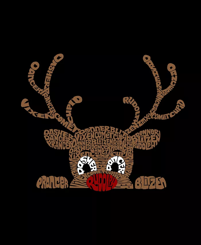 Этот уникальный дизайн представляет собой выглядывающего оленя, искусно созданного из имен всех верных оленей Санты. Имя каждого оленя вплетено в изображение, создавая веселый и праздничный способ отпраздновать праздничный сезон.