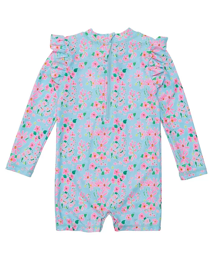 Ваш малыш может безопасно играть на солнце в этом детском купальнике с длинными рукавами, украшенном очаровательным принтом в виде ромашек и игривыми оборками на плечах, которые придают нотку причудливости этой незаменимой вещи для солнечных приключений.