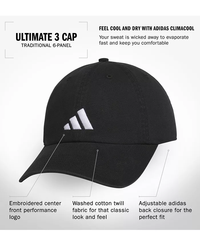 Если вы ищете традиционную кепку из шести панелей из прочного хлопкового твила с предварительно изогнутым краем, то вы ее нашли. Эта повседневная кепка Ultimate 3 от adidas отлично защищает глаза от солнца и лоб от влаги. Застежка сзади регулируется для идеальной посадки, а спереди выделяется смелый логотип из трех полос.