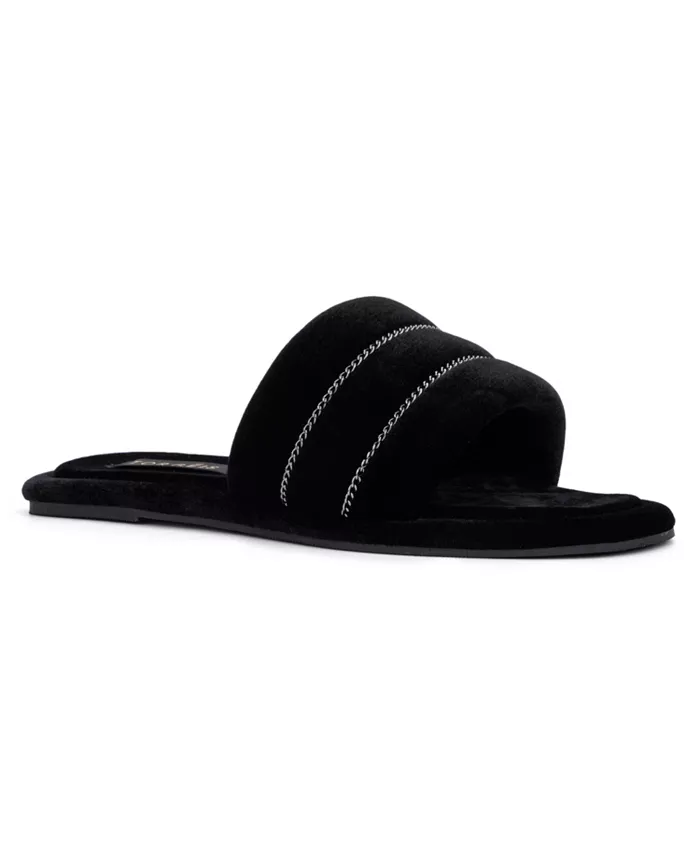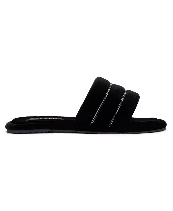 Легкая элегантность в тапочках Georgina. Широкий ремешок на носке с полосатой цепочкой для необычного края. Мягкая, пушистая ткань с прочной резиновой подошвой и соответствующей мягкой подкладкой для комфорта на коже.