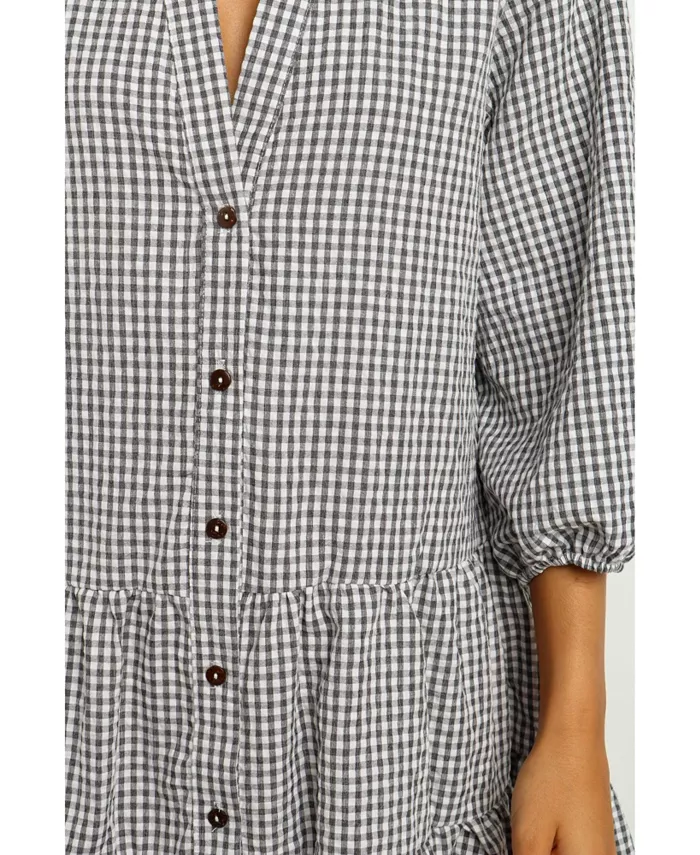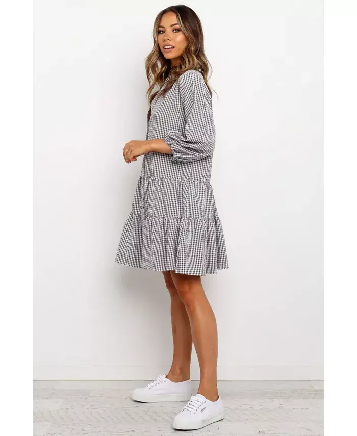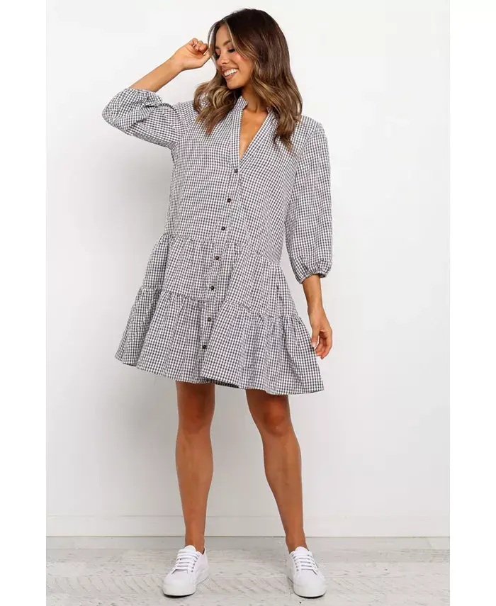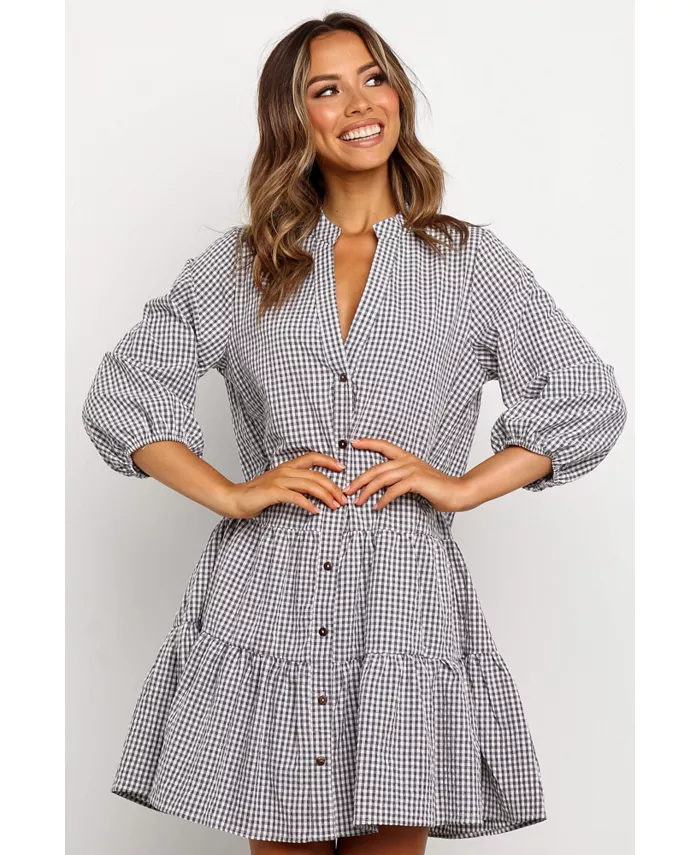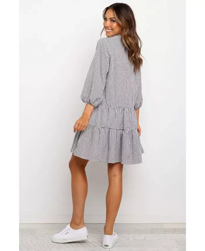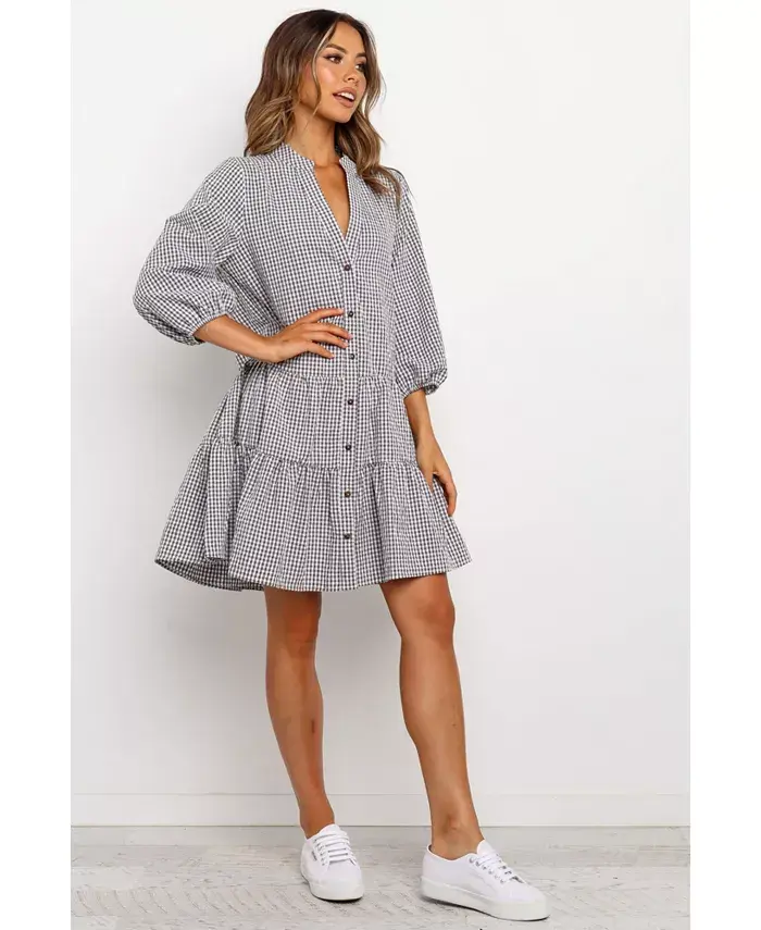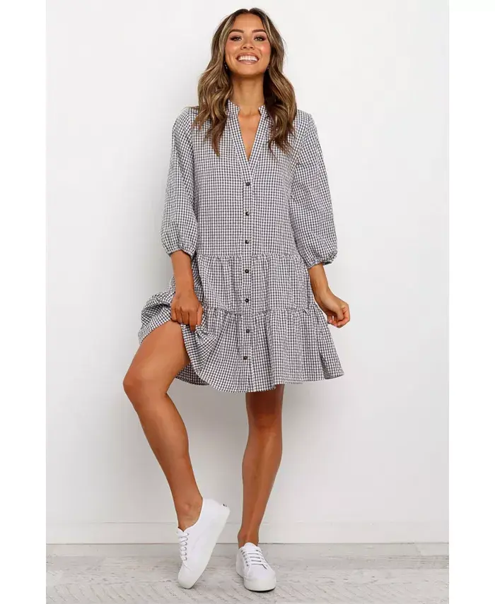 Это великолепное платье с принтом в клетку идеально дополнит ваш летний гардероб! Длина выше колена и свободный крой делают его удобным, но стильным выбором. V-образный вырез придает этому платью женственность, а длинные рукава с эластичными манжетами добавляют элегантности.