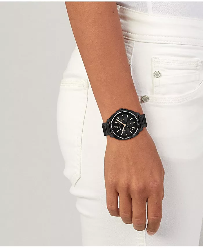 Механизм: Многофункциональный, Циферблат: Черный Корпус: Tonneau, черная сталь с ионным покрытием и кристаллами, 38 мм Ремешок: черный браслет из нержавеющей стали с ионным покрытием и застежкой-кнопкой снизу Водонепроницаемость: до 50 метров