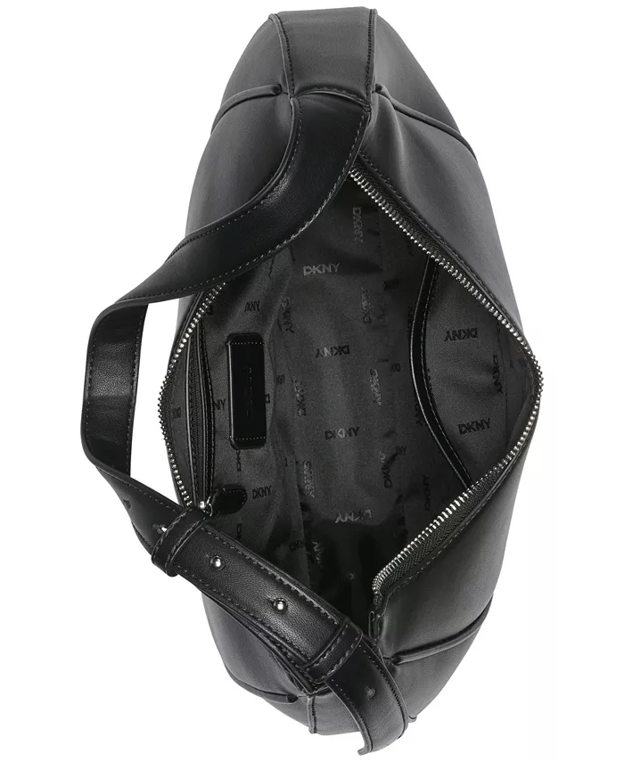 Эта сумка через плечо от DKNY, выполненная в очаровательном изогнутом силуэте с застежкой-молнией, украшена бирками с логотипом, придающими ей культовый вид.