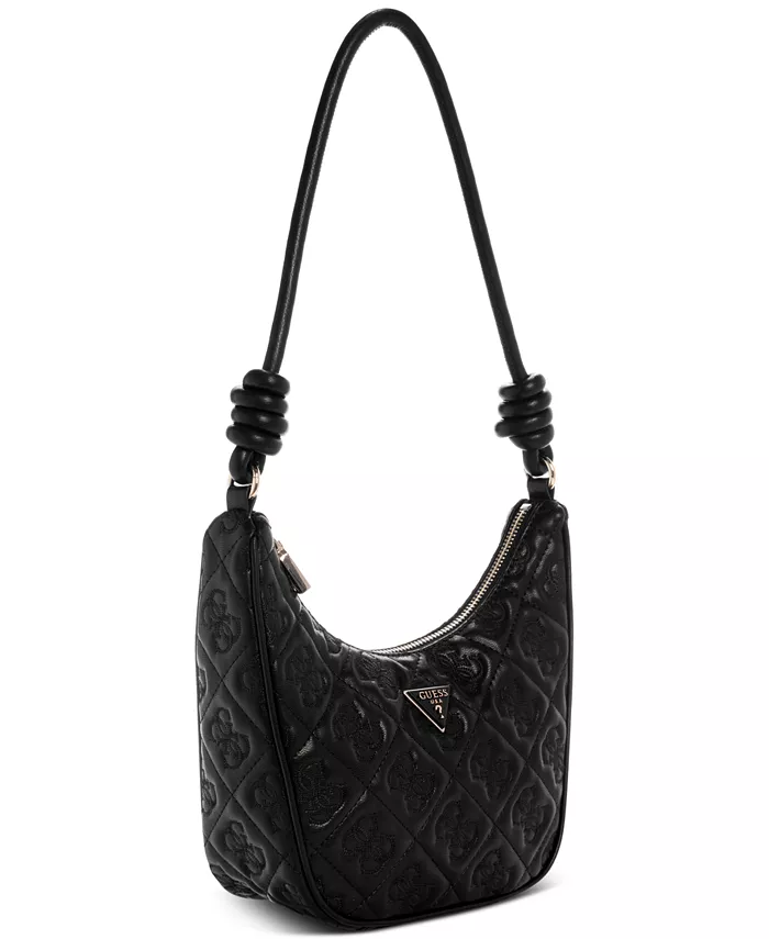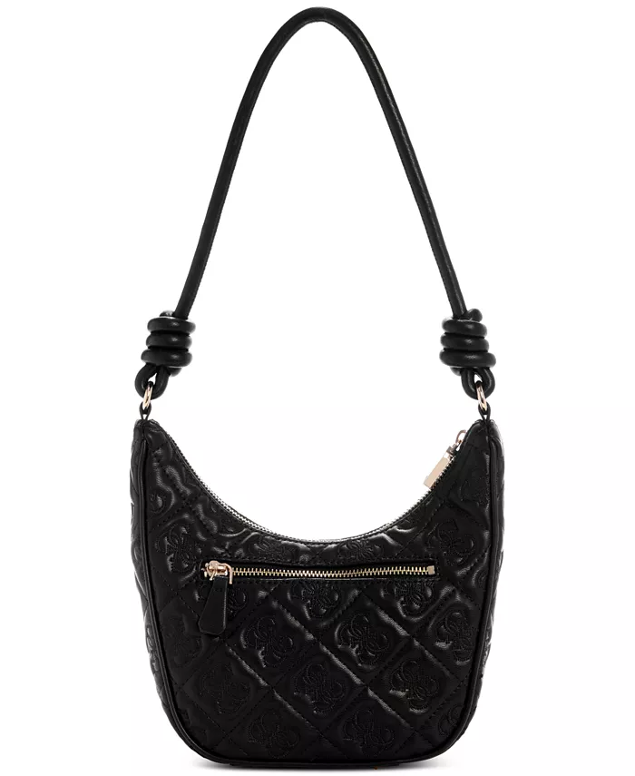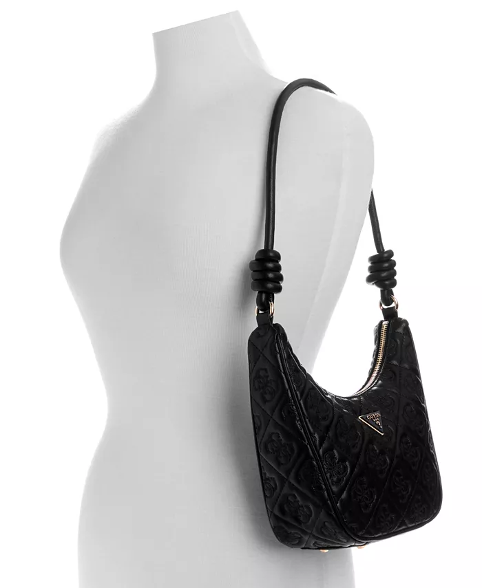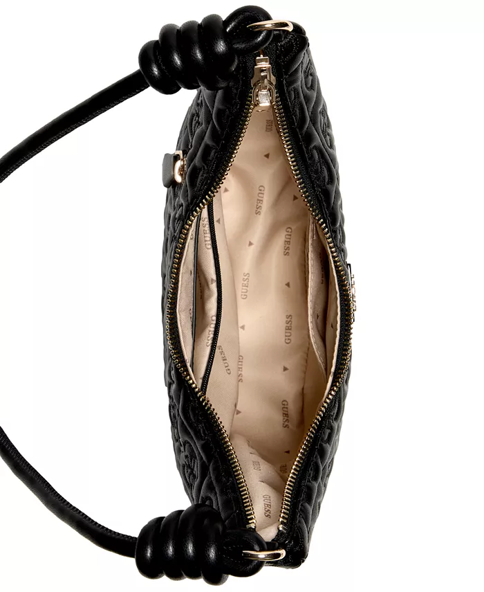 Сумка GUESS, изготовленная из роскошной стеганой искусственной кожи и украшенная вышитым принтом 4G, имеет удобное основное отделение на молнии и длинный плечевой ремень с очаровательными узлами по бокам.