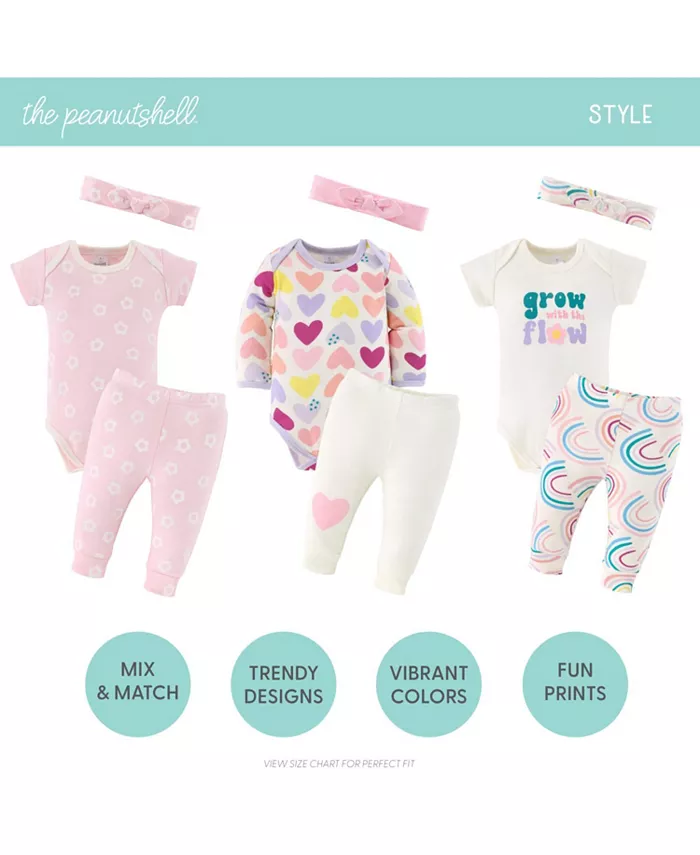 Украсьте свой день с набором постельного белья Pretty Sweet из 30 предметов от The Peanutshell. Этот комплект в тонах драгоценных камней украшен яркими сердечками, радугами и розовыми маргаритками с акцентами лаванды, бирюзы и фуксии. Ассортимент из 30 предметов включает комбинезоны, комбинезоны, носки, шапки и брюки.