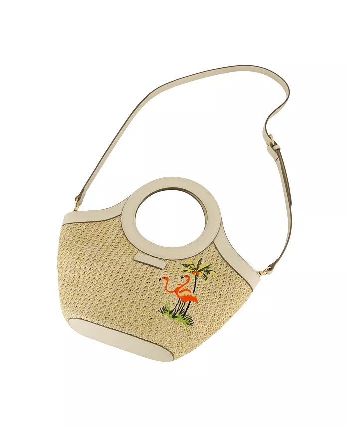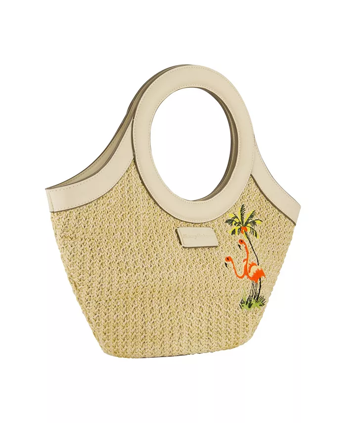 Ощутите непринужденный островной стиль с сумкой Tommy Bahama Flamingo Embroidery Tote. Созданная для солнечных дней и тропических побегов, эта эффектная вещь имеет плетеную текстуру, похожую на солому, и смелый вышитый мотив фламинго и пальмы. Круглые вырезанные ручки добавляют современный штрих, а просторное внутреннее пространство обеспечивает достаточно места для ваших самых необходимых вещей. - Высота ручки 7 дюймов - Материал: 80% полиэстер, 20% полиуретан - Размеры: 13H X 14W X 3.5D - Вес: 1 фунт. - Импортная
