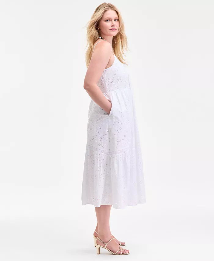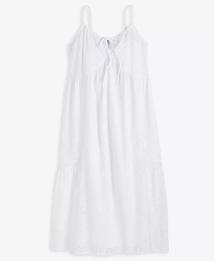Приблизительно 48 дюймов в длину от центра спинки до подола. Вырез горловины «лодочка»; завязки. Опускается ниже колена, чтобы опустить икру Хлопок: тканый и свежий; очень мало тянется Тянет на Сшит под грудью; ткань с люверсами и кружевной отделкой. Набедренные карманы в швах Регулируемые бретельки-спагетти Подкладка 100% хлопок; подкладка: 100% хлопок Машинная стирка