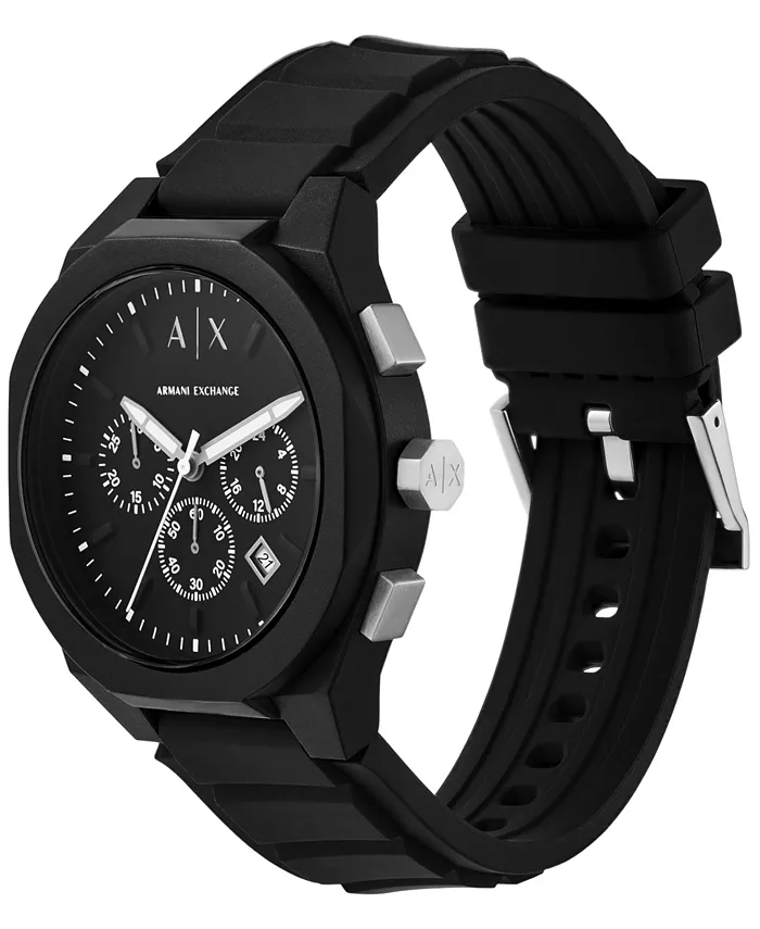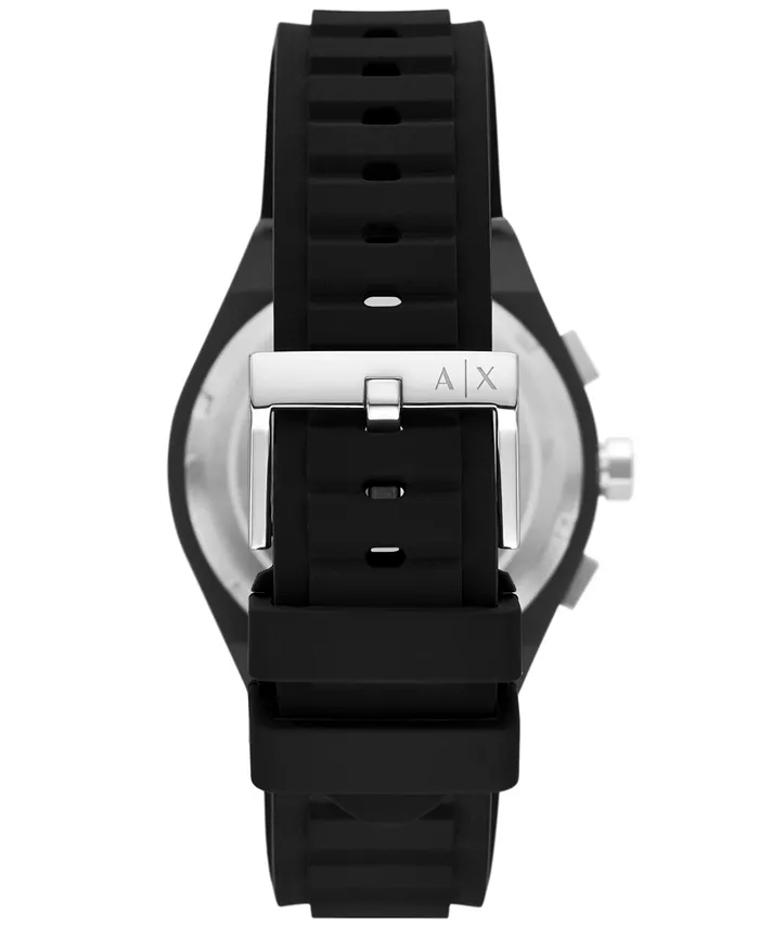 Часы A|X Armani Exchange диаметром 44 мм имеют черный матовый циферблат, механизм хронографа и черный силиконовый ремешок. Модель #AX4161