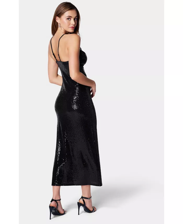 Длинное облегающее платье-макси Bebe Spaghetti Gown излучает элегантность и утонченность, что делает его идеальным выбором для особых случаев или гламурного вечера.