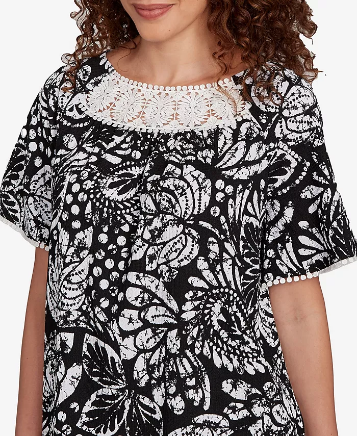 Эта воздушная футболка имеет оборчатые рукава с отделкой, яркий узор «островной пейсли» и кружевную вставку вдоль горловины, что придает ей неповторимый тропический шарм.