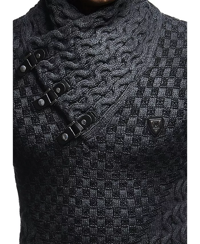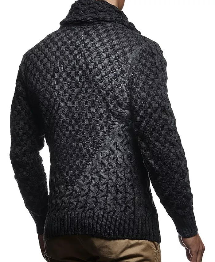 Модель крупной вязки: имеет смелый фактурный рисунок с косами и клетчатыми деталями, идеально подходит для создания строгого мужественного образа.
