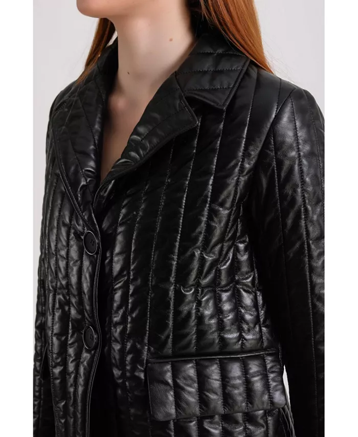 Модель: BZ0185-CPT-BLK Внешний материал: стеганый черный Материал: 100% британская овчина Особенности: застежка на пуговицы спереди Стеганый дизайн Два передних кармана с клапанами Воротник с заостренными лацканами Длинные рукава Приталенный силуэт