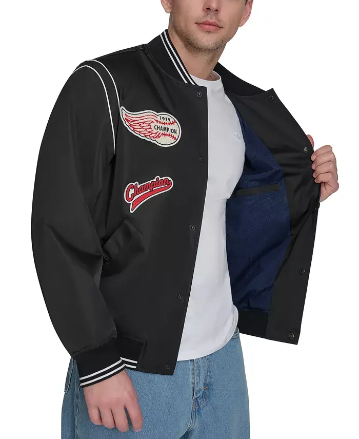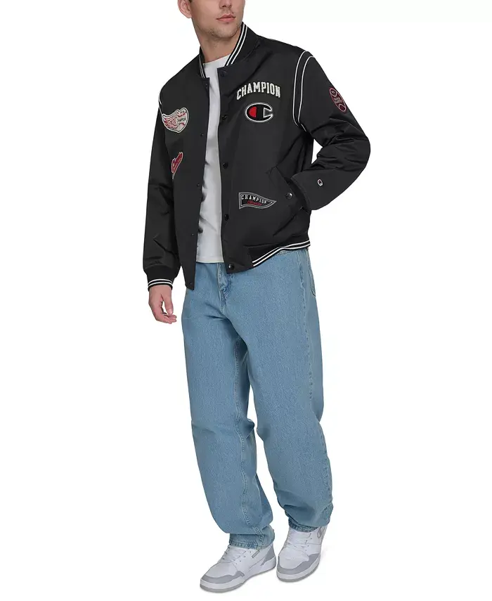 Эта куртка-бомбер от Champion, украшенная логотипом в области сердца, уникальным набором нашивок и стратегических полос, является воплощением университетского стиля.