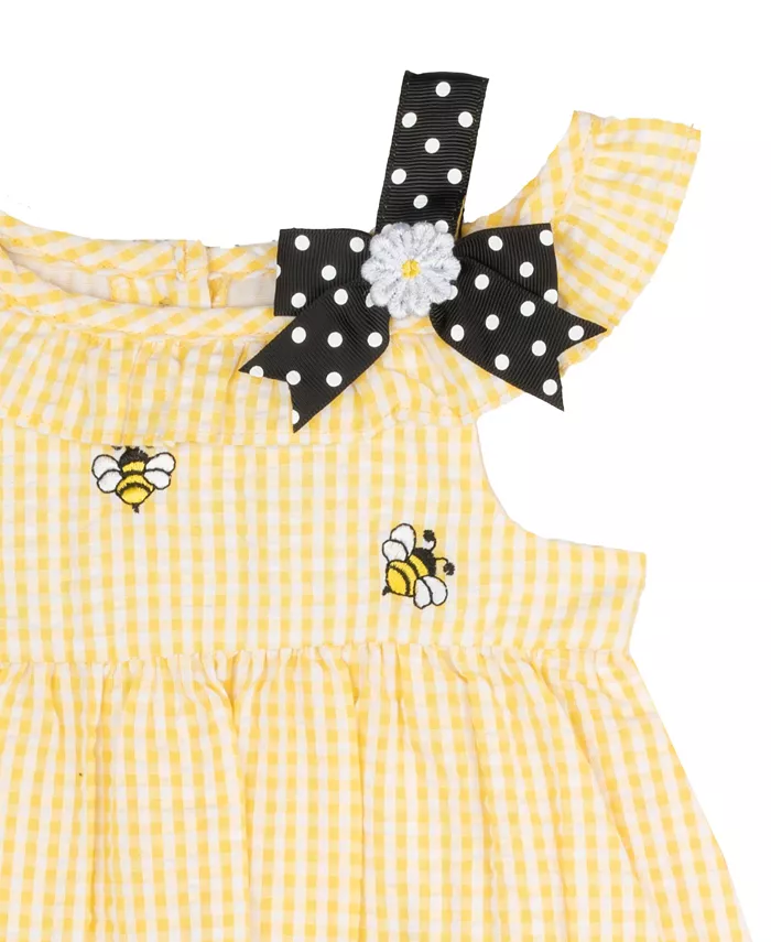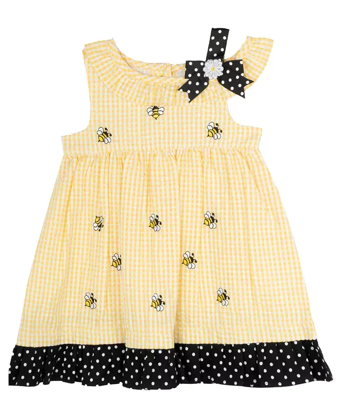 Платье для девочки из сирсакера с открытыми плечами, с узором «пчела» по всей поверхности и отделкой на юбке-крылышках.