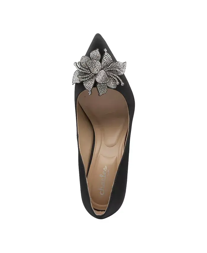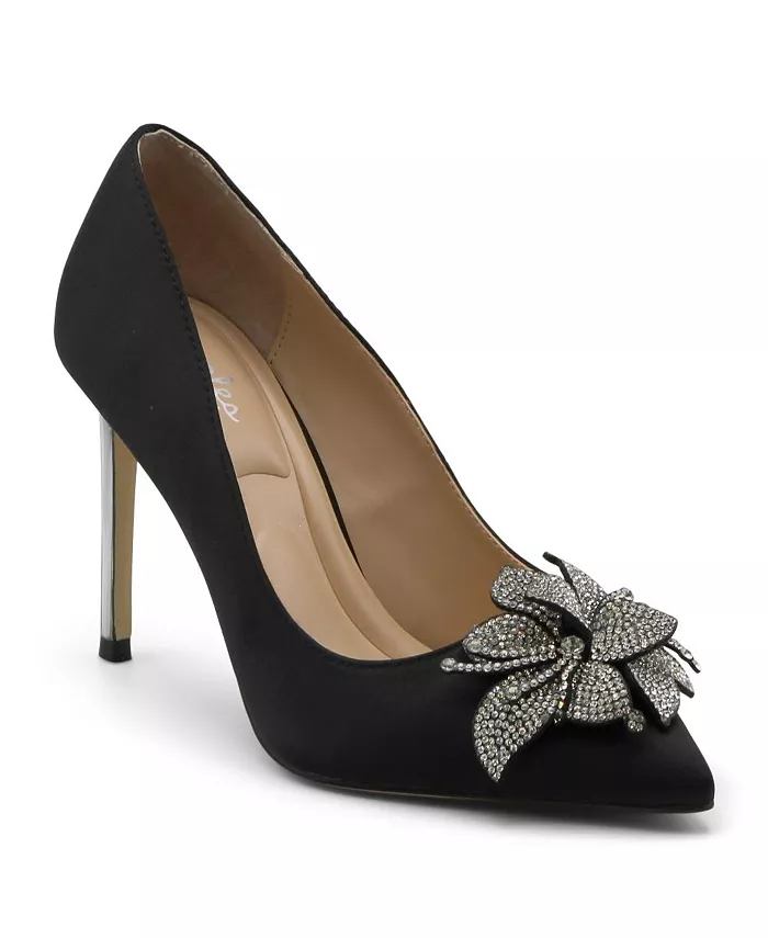 Блестящие стразы и металлический каблук-стилет придают этим атласным туфлям эффект «вау»