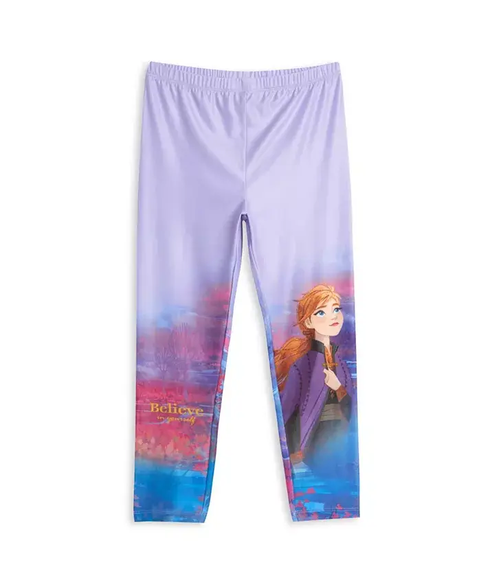Серые леггинсы с принтом королевы Эльзы и Олафа по всей поверхности. Фиолетовые леггинсы с трафаретным принтом принцессы Анны и текстом «Верь в себя». Синие леггинсы с очаровательным изображением королевы Эльзы.