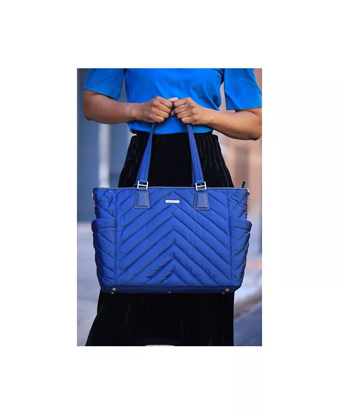 Размеры сумки-тоута: 16"Ш x 13"В x 6"Г Размеры сумки для ланча: 11"Ш x 5.5"В x 5"Г Размер пакета: 8"Ш x 5"В Размер сумки для обуви: 12"Ш x 17"В Застежка-молния сверху и снизу сзади Длина ручки 10,5 дюймов; съемный регулируемый ремень 47 дюймов Примерный вес: 2,2 фунта. Табличка с логотипом Фурнитура золотистого цвета Снаружи: верхний задний карман на молнии, карман-тележка, вход на молнии в заднее нижнее отделение сумки, два расширяемых боковых кармана, укрепленное дно. Три держателя для чернильных ручек; съемный брелок для ключей Внутри: 2 кармана на молнии, 1 накладной карман, 1 карман для ноутбука, подходит для ноутбука 16 дюймов. Размер: Большой Материал: Нейлон, Отделка: ПВХ; Подкладка: Полиэстер Чистка местами