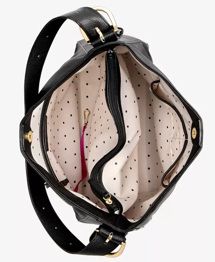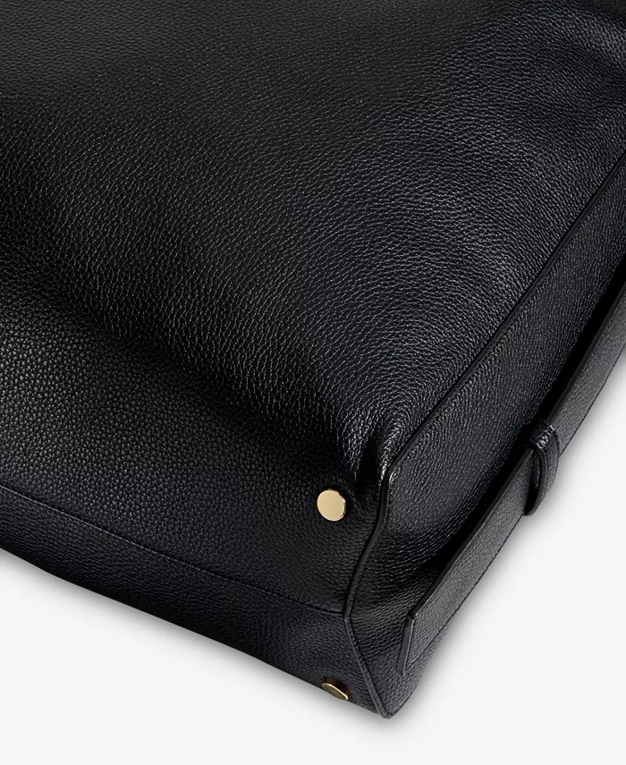 Сумка большого размера; 14-1/5"Ш x 15-4/8"В x 6"Г (ширина измеряется по дну сумки); вес около 1,77 фунта Силуэт основан на модели ростом 5 футов 9 дюймов. Регулируемая ручка 6"L Застежка-кнопка Золотистая фурнитура и внешний карман на молнии сзади, внутреннее центральное отделение на молнии, карманы на молнии и накладные карманы Совместимость с ноутбуком (стандартный размер 13"-15") 100% ПУ; подкладка: 100% полиэстер Чистка местами