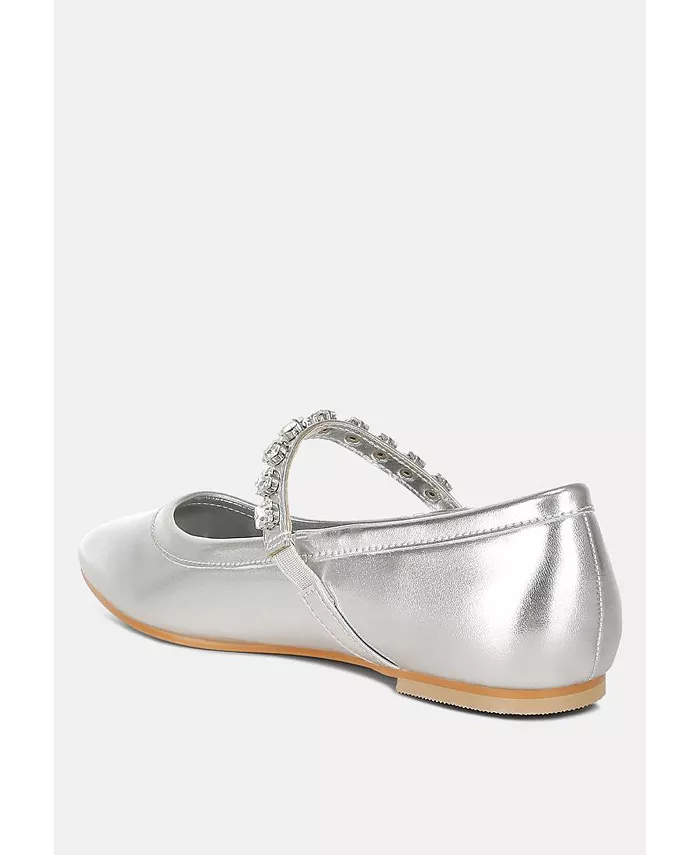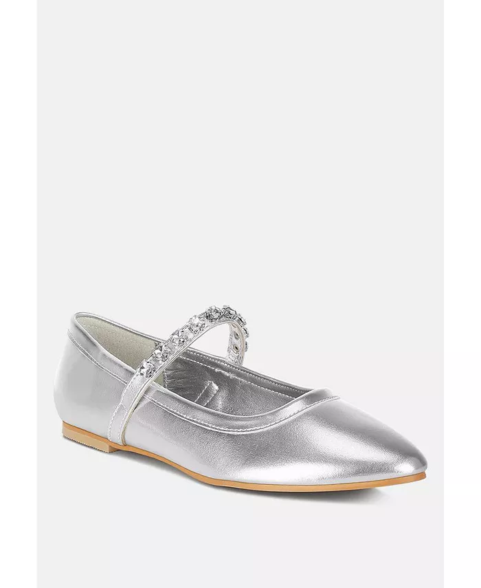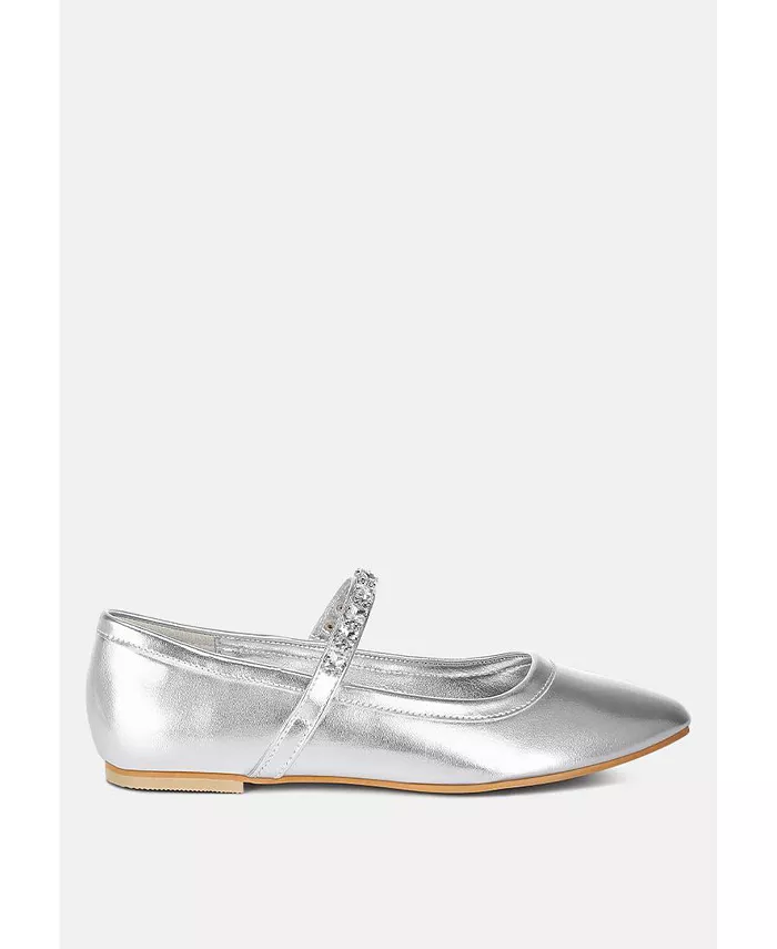 Роскошные балетки Mary Jane из металлизированной кожи — обязательное дополнение к вашему гардеробу. С классическим ремешком, украшенным стразами, мягкими стельками и плоским каблуком эти туфли удобны и стильны. Универсальный силуэт позволяет легко сочетать их с любым нарядом!