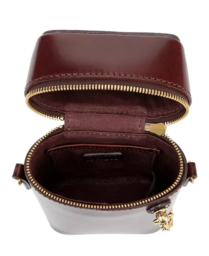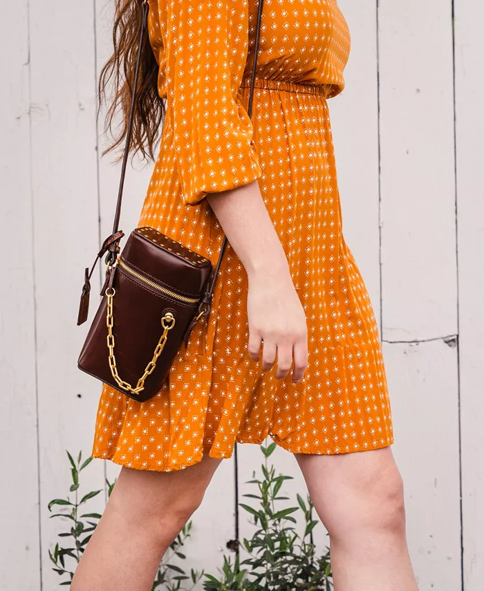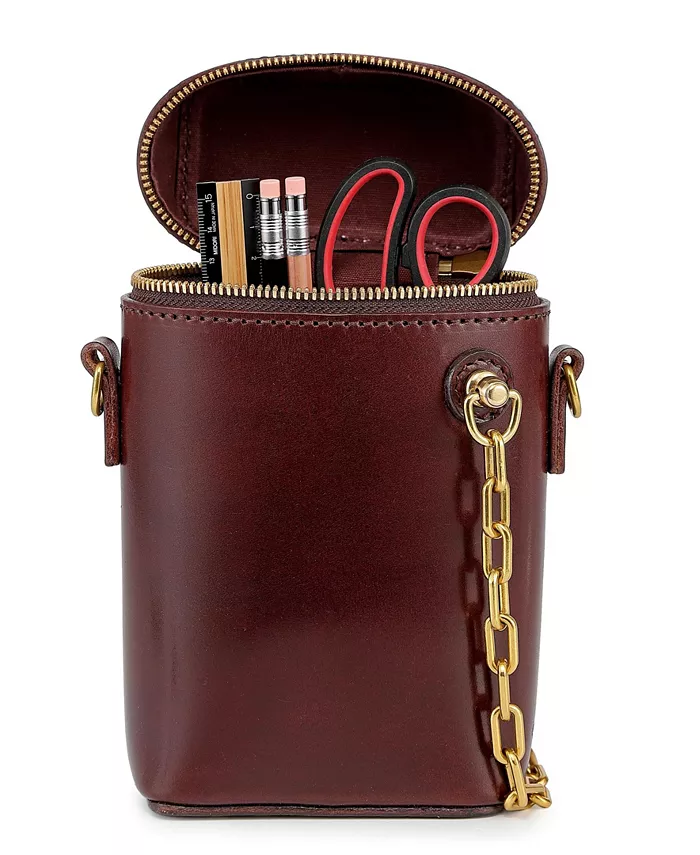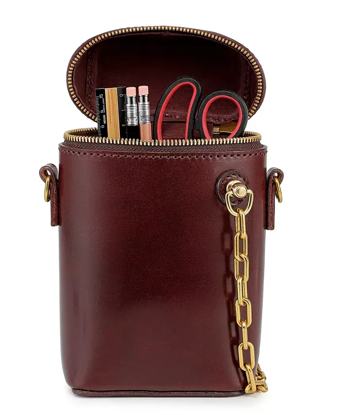 Наша Oranda Slim Crossbody имеет уникальный дизайн с прочной латунной цепью, которая служит ручкой, и застежкой-молнией. Она также может стоять вертикально и жить на вашем столе как стильный органайзер.