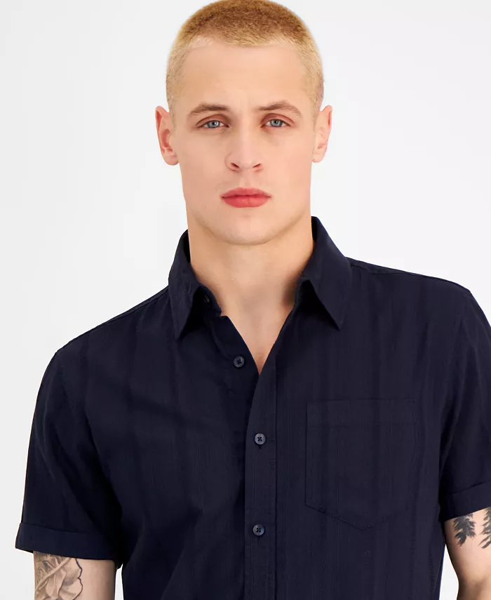Рубашка на пуговицах с короткими рукавами от Sun + Stone, идеально подходящая для непринужденного ношения навыпуск, выполнена в ледяном синем цвете и прекрасно сочетается с вашими любимыми брюками чинос и слаксами.