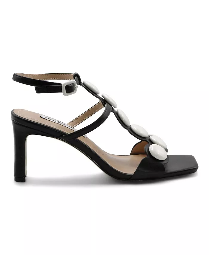 Эти босоножки украшены Т-образным ремешком, обрамленным угловатым квадратным носком и каблуком-полублоком.