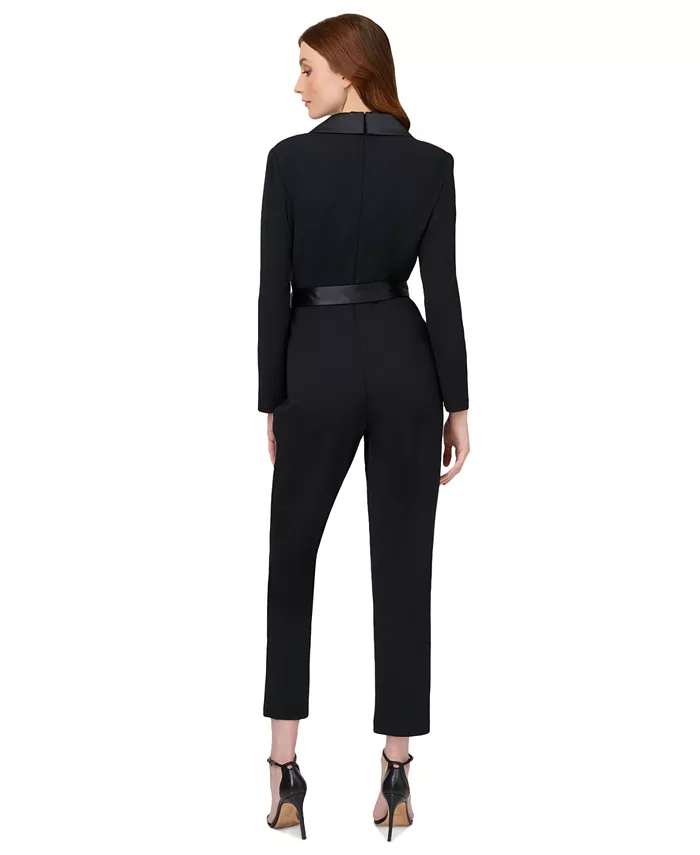 Двусторонний матовый и атласный галстук придает элегантную изюминку этому комбинезону в стиле смокинга от Adrianna Papell.