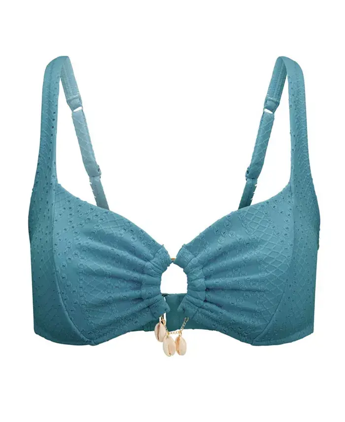 Этот бикини-топ изготовлен из ткани с люверсами и оснащен съемными подушечками, фурнитурой с кольцами и декоративными ракушками, регулируемыми бретельками и застежкой-крючком.