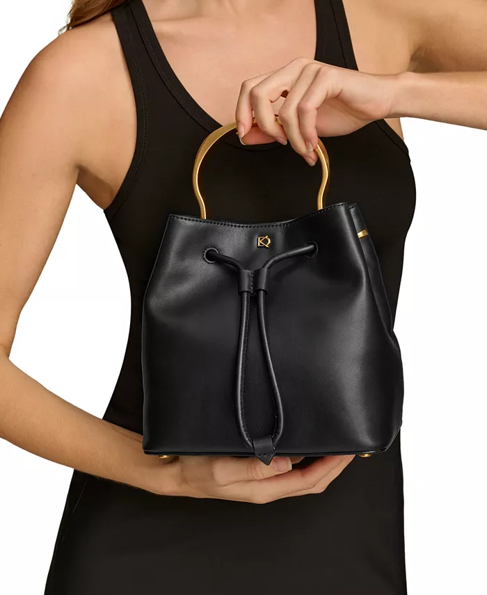 Эта сумка-ведро от Donna Karan, украшенная стильной металлической ручкой, выполнена из кожи и оснащена съемным ремнем через плечо, чтобы освободить руки.