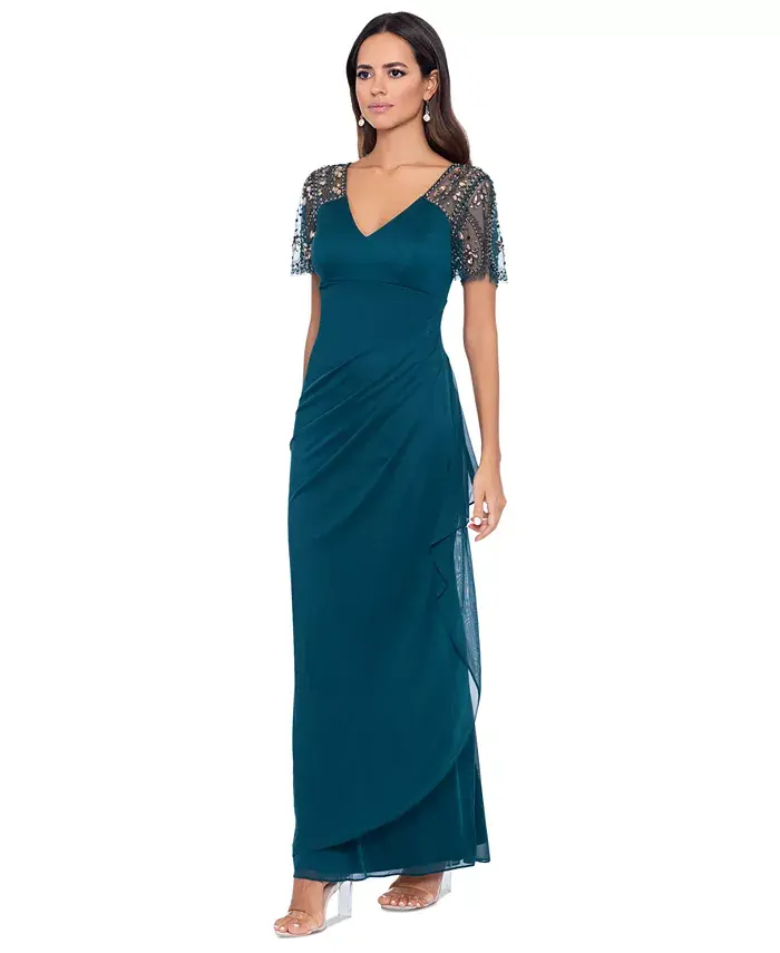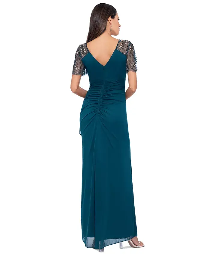 Блестящие рукава и продуманно драпированный шифон создают это великолепное вечернее платье от XSCAPE, идеальный стиль для особого случая.