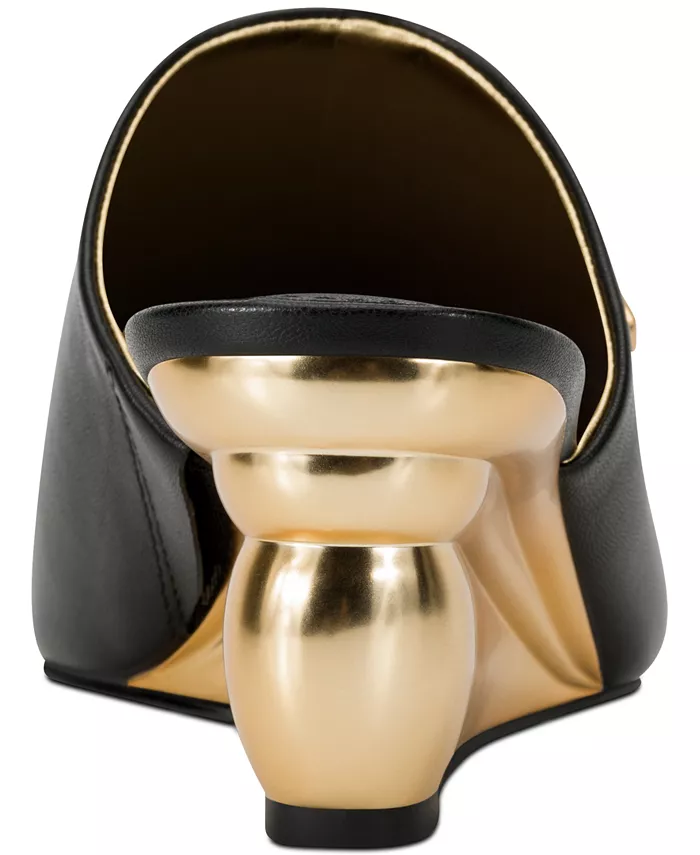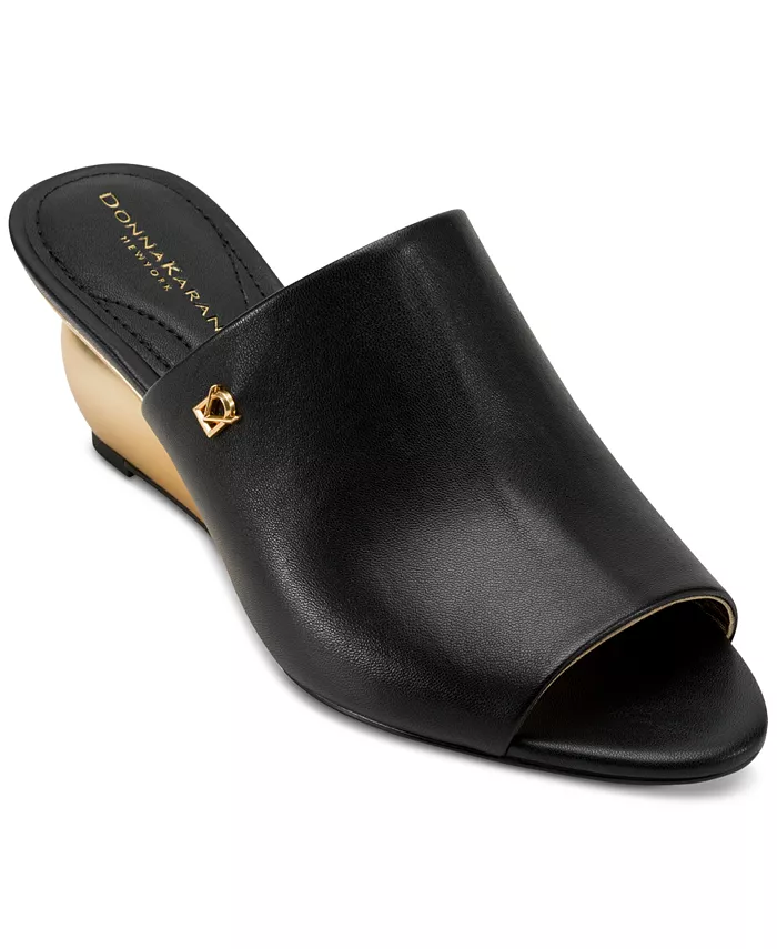 Металлическая золотистая танкетка подчеркивает сдержанный силуэт босоножек Donna на танкетке от Donna Karan New York.