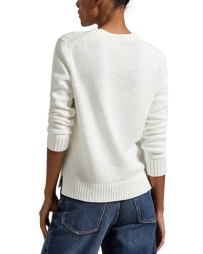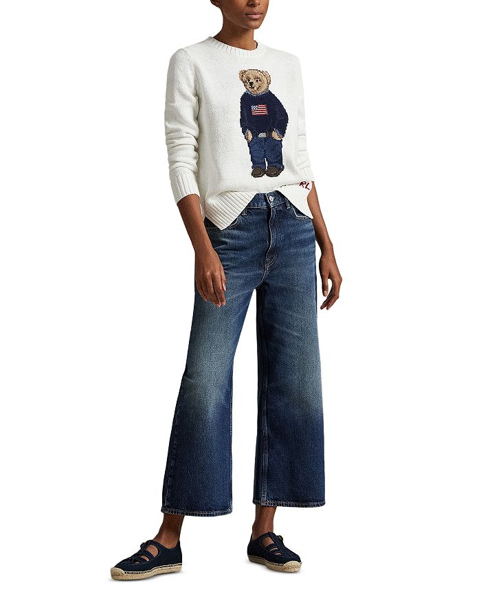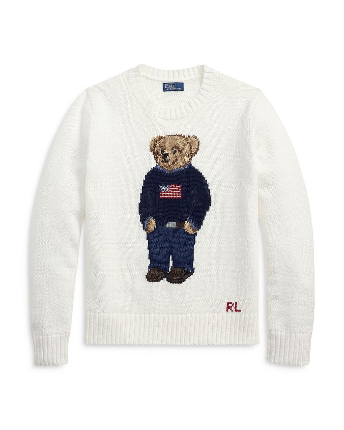 Polo Bear дебютировал в 1991 году. За прошедшие десятилетия он общался с мировыми знаменитостями, о нем писала пресса, и он бесчисленное количество раз появлялся в мире Ральфа Лорена. На этом легком свитере из хлопка и льна он одет в фирменном стиле Polo, надев мокасины, джинсы, ремень и свитер с американским флагом.