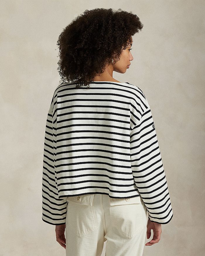 Эта футболка в морском стиле с вырезом-лодочкой, выполненная из хлопкового трикотажа, окрашена пряжей для создания горизонтального полосатого узора и украшена фирменной тканой этикеткой «Polo RL & Co.» на рукаве.