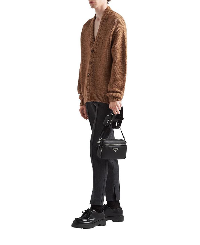 Сумка Prada из элегантно текстурированной кожи Saffiano с двумя отделениями на молнии и съемным мешочком, украшенная культовым металлическим треугольным логотипом спереди.