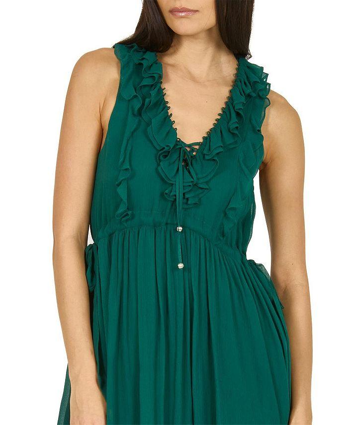 Это платье из воздушного шелкового шифона имеет оборчатый вырез с регулируемыми завязками и завышенную талию для создания нотки романтики.