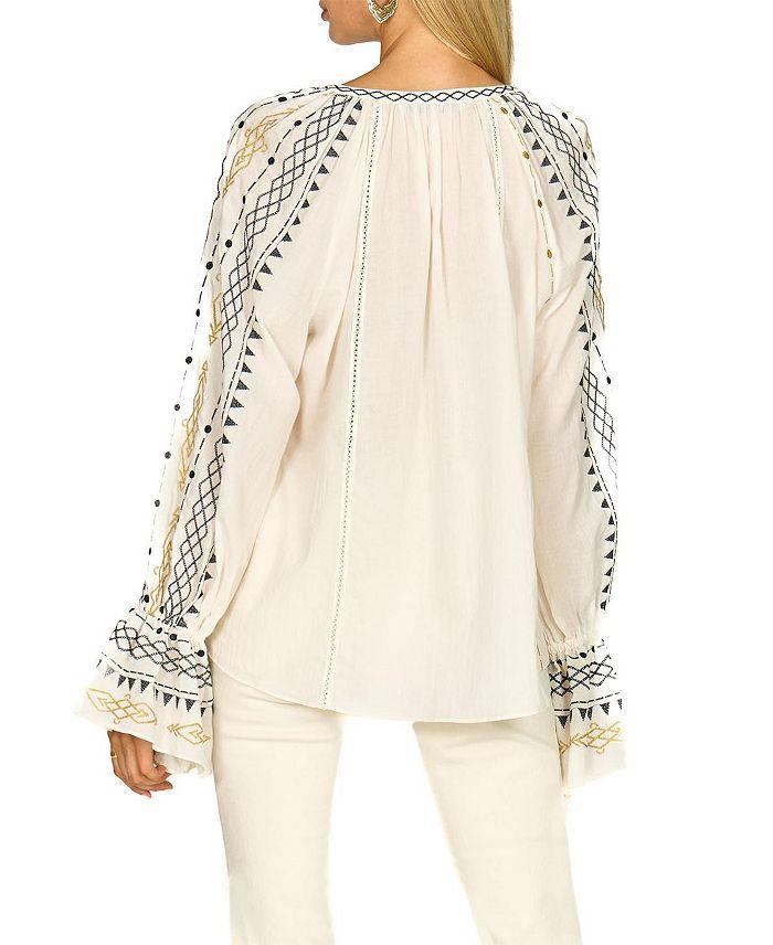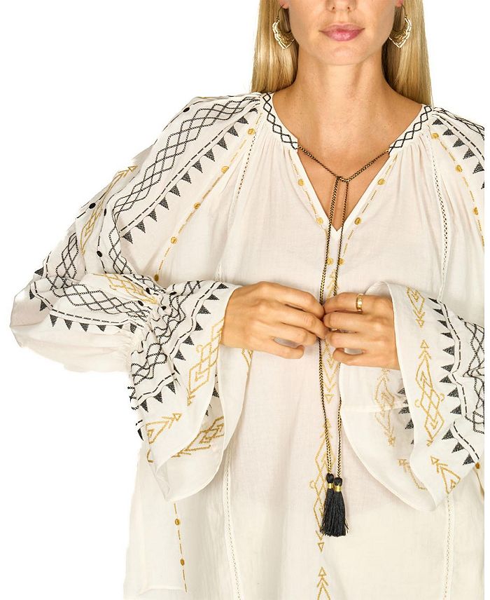 «Милли» — это свободная крестьянская блузка из хлопчатобумажной вуали с замысловатой вышивкой в богемном стиле, украшенная завязывающимся вырезом с кисточками.