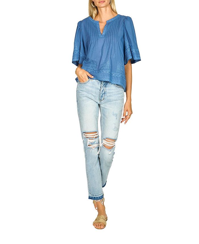 Верх «Kali» выполнен из легкой, воздушной хлопковой вуали в свободный, свободный силуэт. Сложная вышивка определяет его оборчатые рукава и широкий низ.
