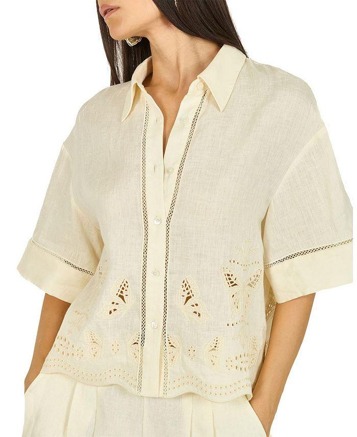 Верх застегивается на пуговицы, украшен сложной вышивкой в виде бабочки и разрезом сзади.
