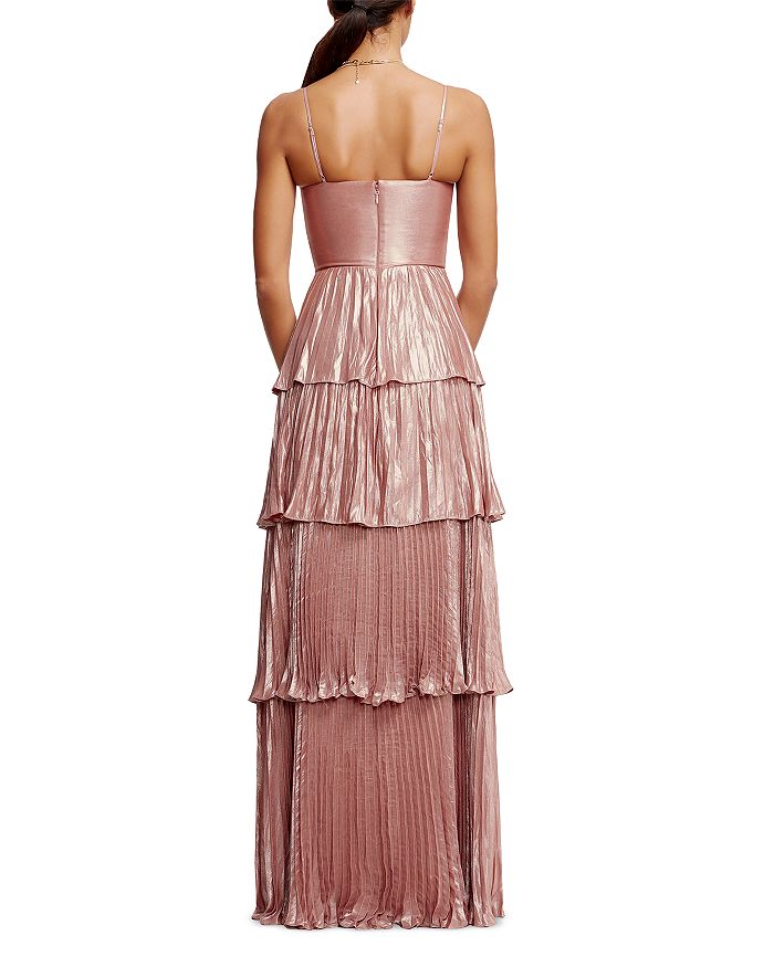 Плиссированная передняя часть груди, вырез на лифе спереди, плиссированная многоярусная юбка