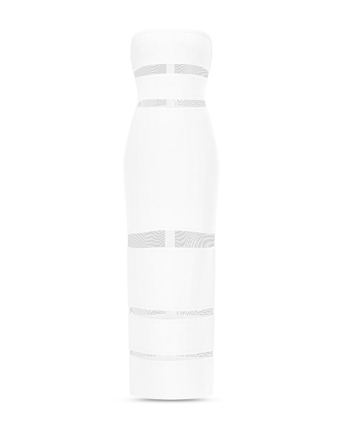 Платье Vera от Hervé Léger имеет силуэт колонны во всю длину из облегающего трикотажа. Дизайн без бретелек дополнен эластичной сеткой и дополнен разрезом сзади и молнией по центру спины.