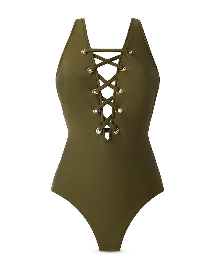 Глубокий V-образный вырез со шнуровкой и золотистыми люверсами