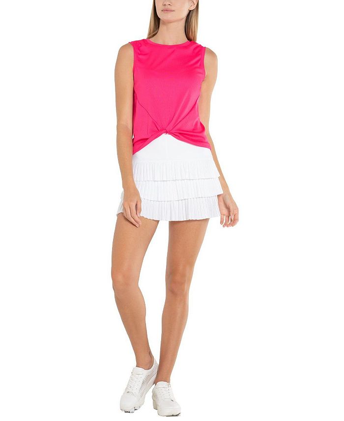Белая майка с забавной изюминкой! Эта майка с круглым вырезом, полной спиной, сетчатыми вставками и предварительно закрученным узлом спереди со стильными линиями для создания привлекательного укороченного образа.
