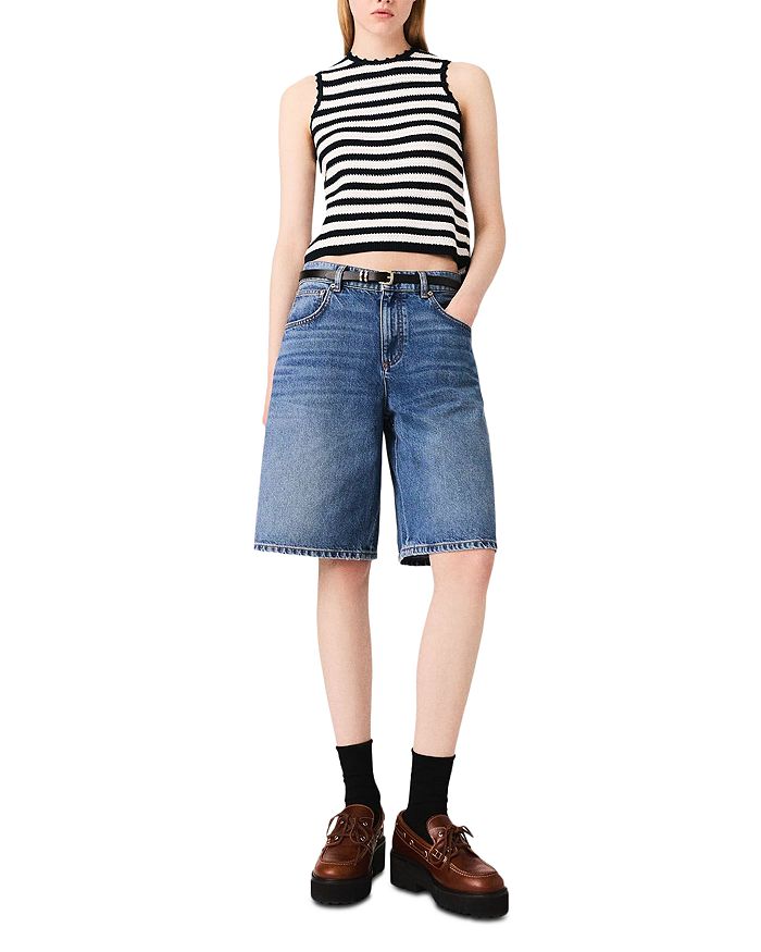 Maje пересматривает неотъемлемую часть сезона: выцветшие джинсовые шорты-бермуды. Классический дизайн с застежкой на молнию и пуговицы, а также шлевками для ремня делает его универсальным и простым в сочетании предметом. Жакрон Clover на спине добавляет тонкую подпись к этому вневременному предмету.
