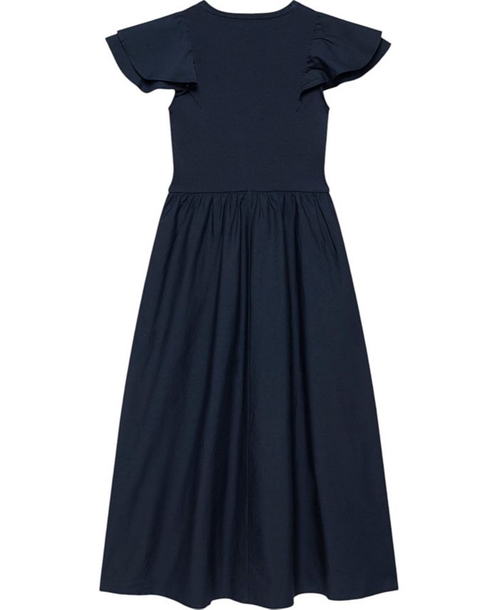 Платье темно-синего цвета, силуэта миди, с V-образным вырезом и многослойными рукавами-крылышками.