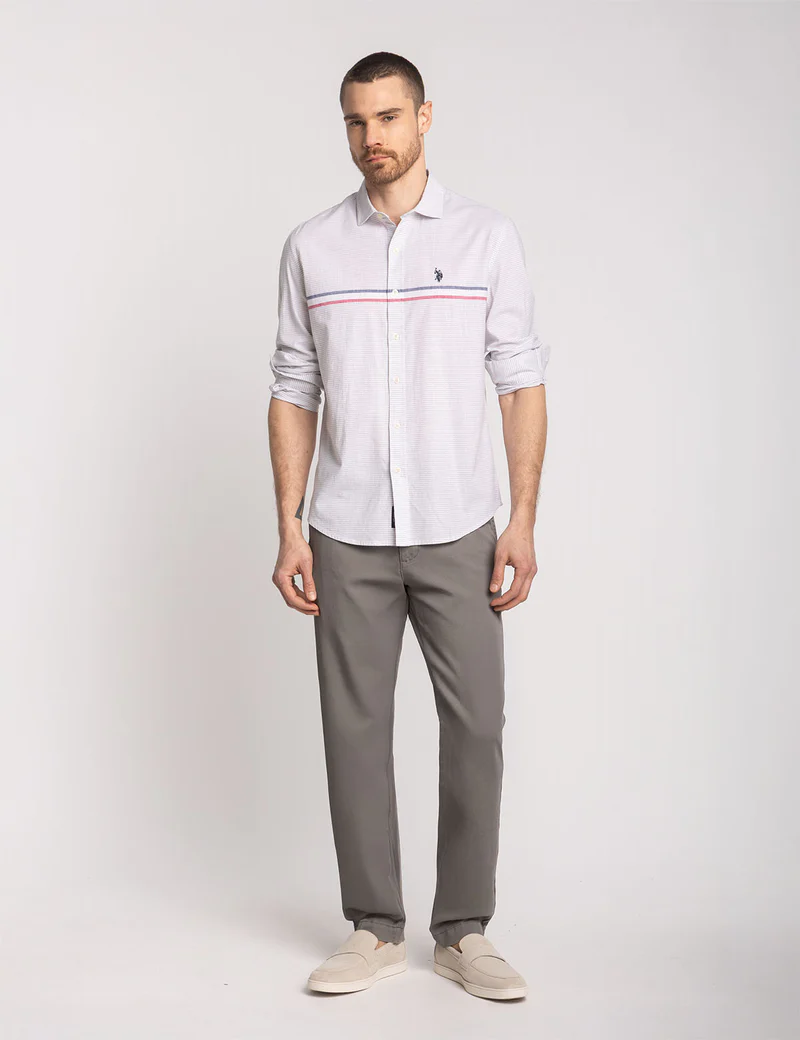 Современная интерпретация классического стиля – эта рубашка из поплина с длинным рукавом и полосками Engineered Stripe с застёжкой на пуговицы спереди и полосками Engineered Stripe на груди, создающими визуальный акцент. Приталенный силуэт дополняется строгим заострённым воротником и регулируемыми манжетами на пуговицах, что позволяет носить её как заправленной, так и навыпуск. Эта рубашка с вышитым фирменным логотипом на груди легко перейдёт как в повседневный образ, так и в более элегантный. На модели размер M.