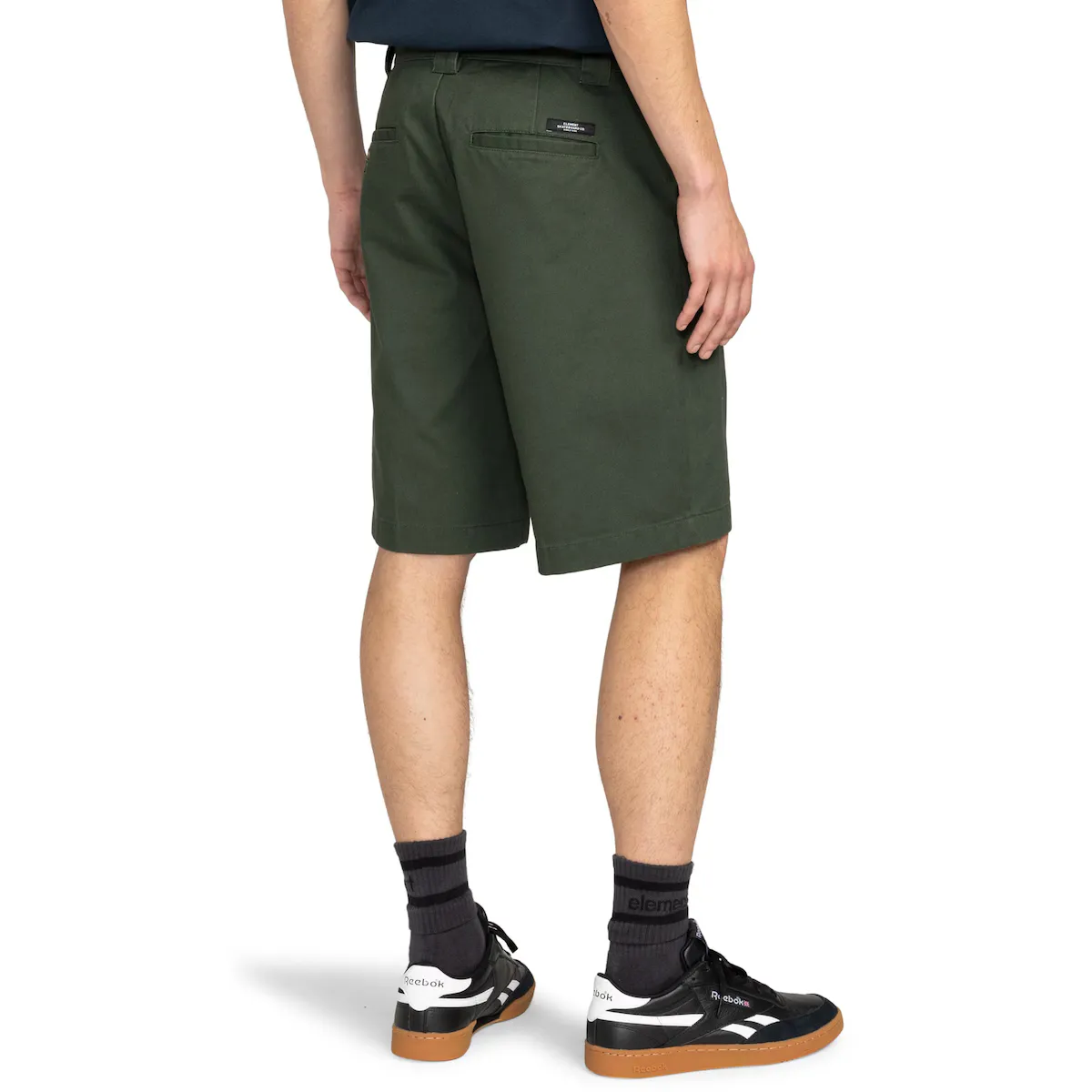 Короткие брюки для мужчин. Основные характеристики: Коллекция: коллекция Mainline, Устойчивость к природе: переработанный хлопок GRS, Ткань: саржевый материал из смеси 60% переработанного хлопка и 40% полиэстера (276 г/м2), Крой: свободный, Застежка: застежка на молнию, Пояс: фиксированный пояс, Застежка: скрытая застежка на пуговице и металлическом крючке на поясе, Росток: обычный, Крой ноги: прямая нога, Длина: 21,8 дюйма, Открытие ноги: открытие ноги 31 см, Карманы: вшитые боковые карманы, карман для монет, задние карманы с двумя клапанами, левый карман на пуговице, Бренд: клип-ярлык Element на боковом шве, Ярлык Element Skateboard Co. на задней части и Другие детали: карман для монет.
