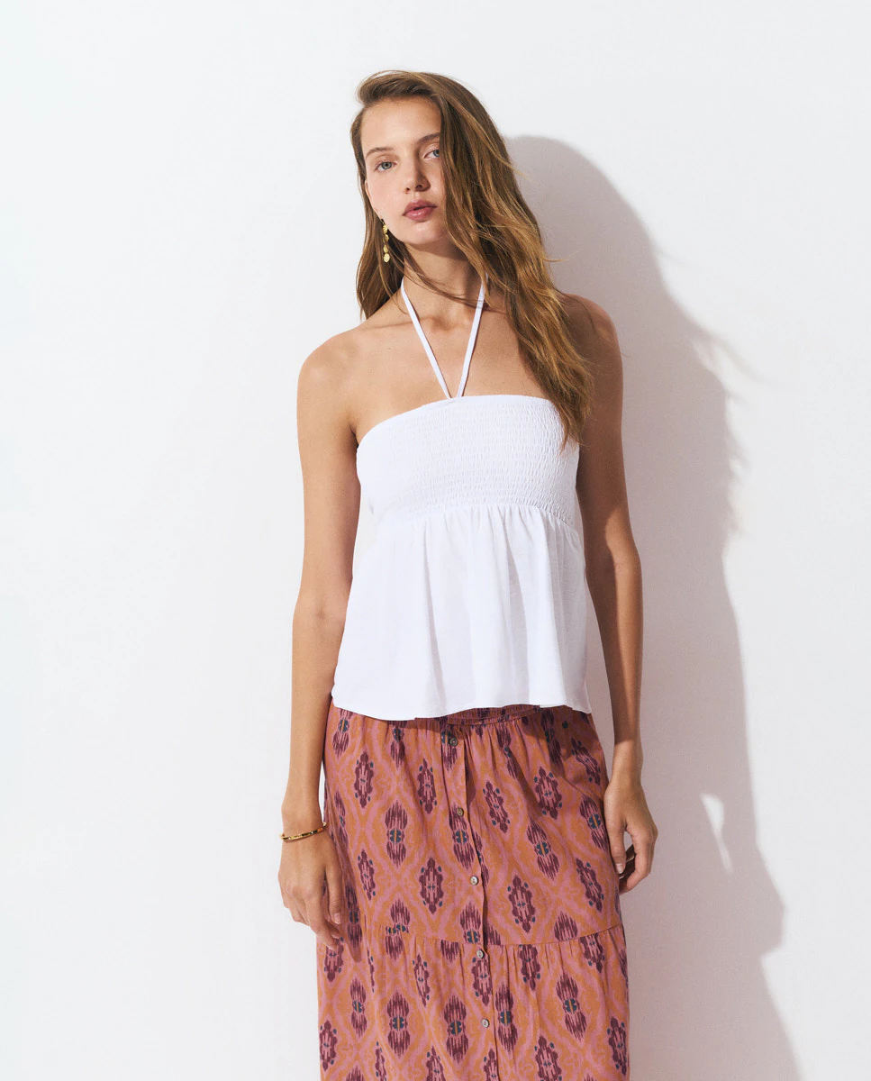 Топ на бретелях с сборкой и воротником халтер на завязках.
