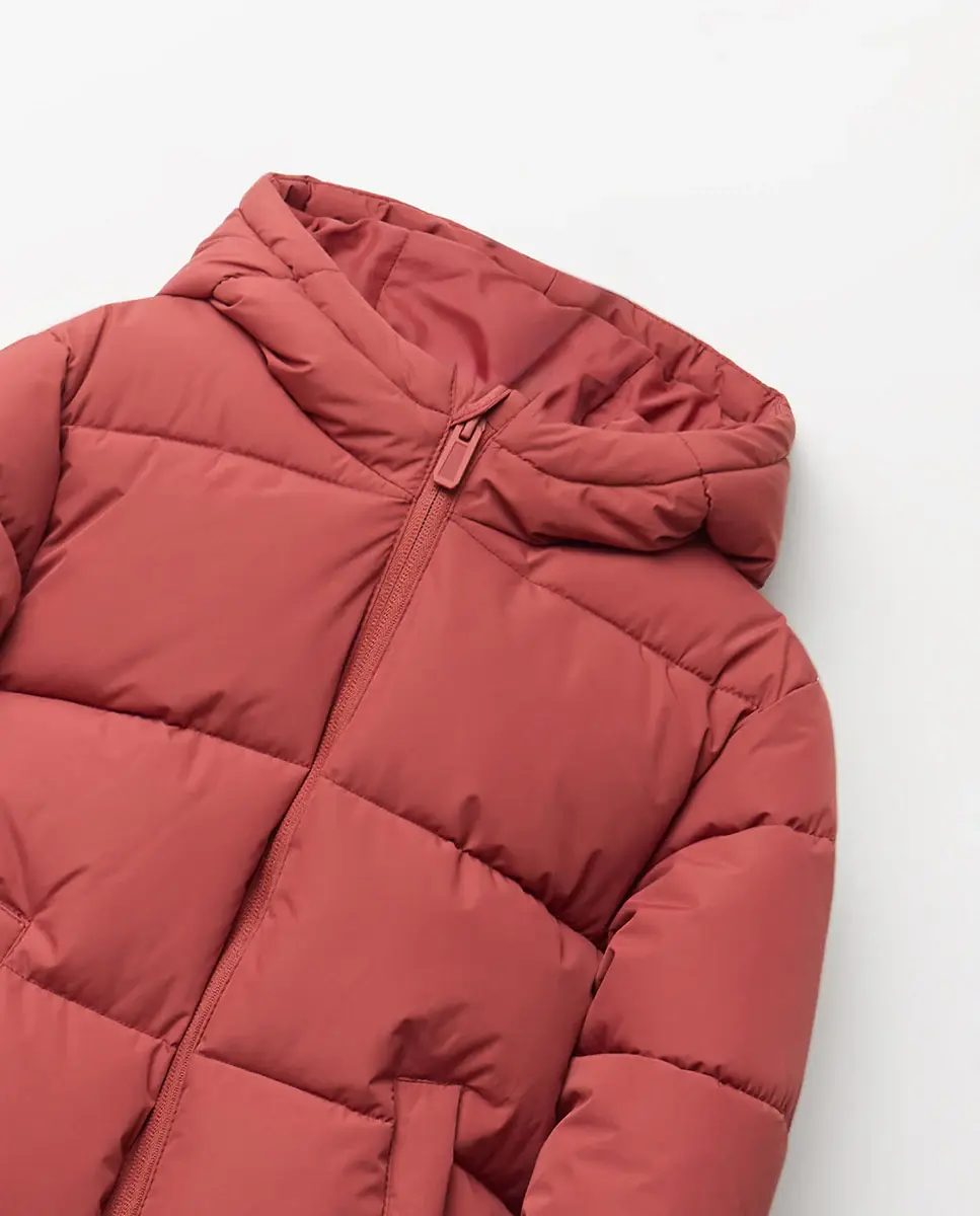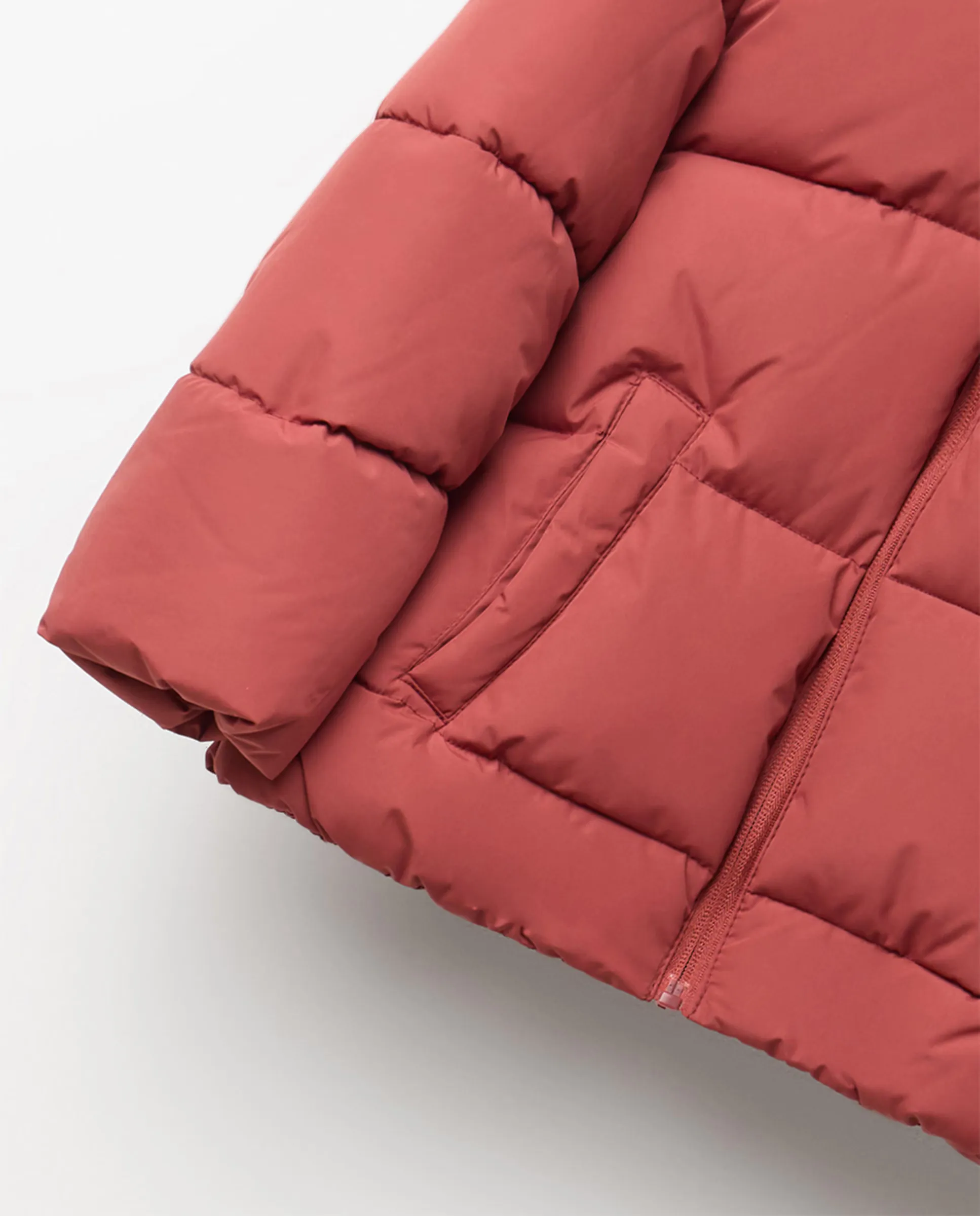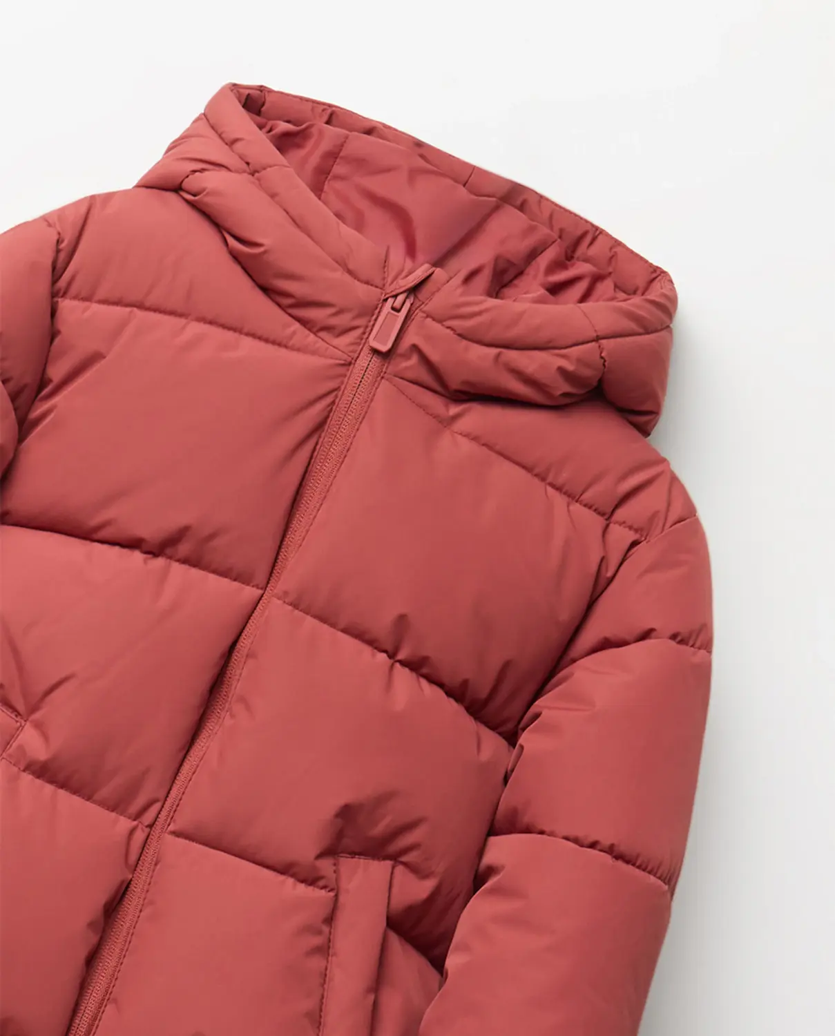 Пуховик с капюшоном и карманами. Застежка на молнии.