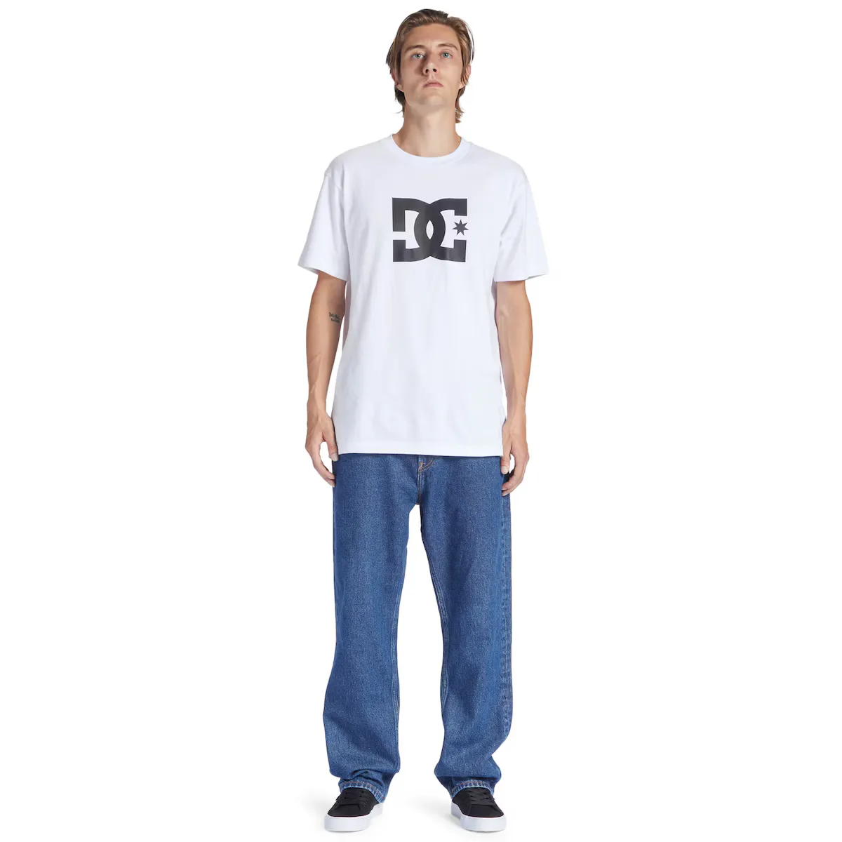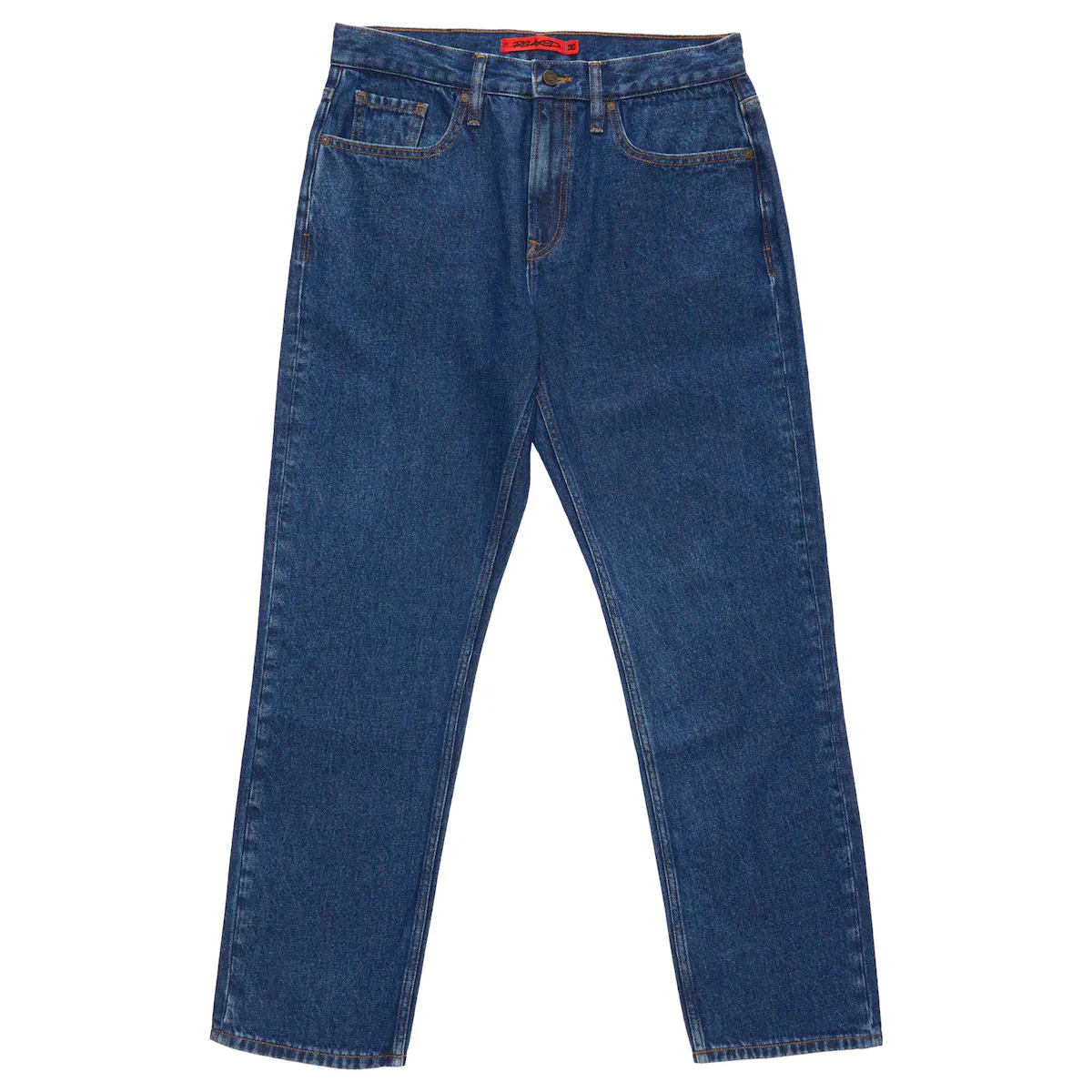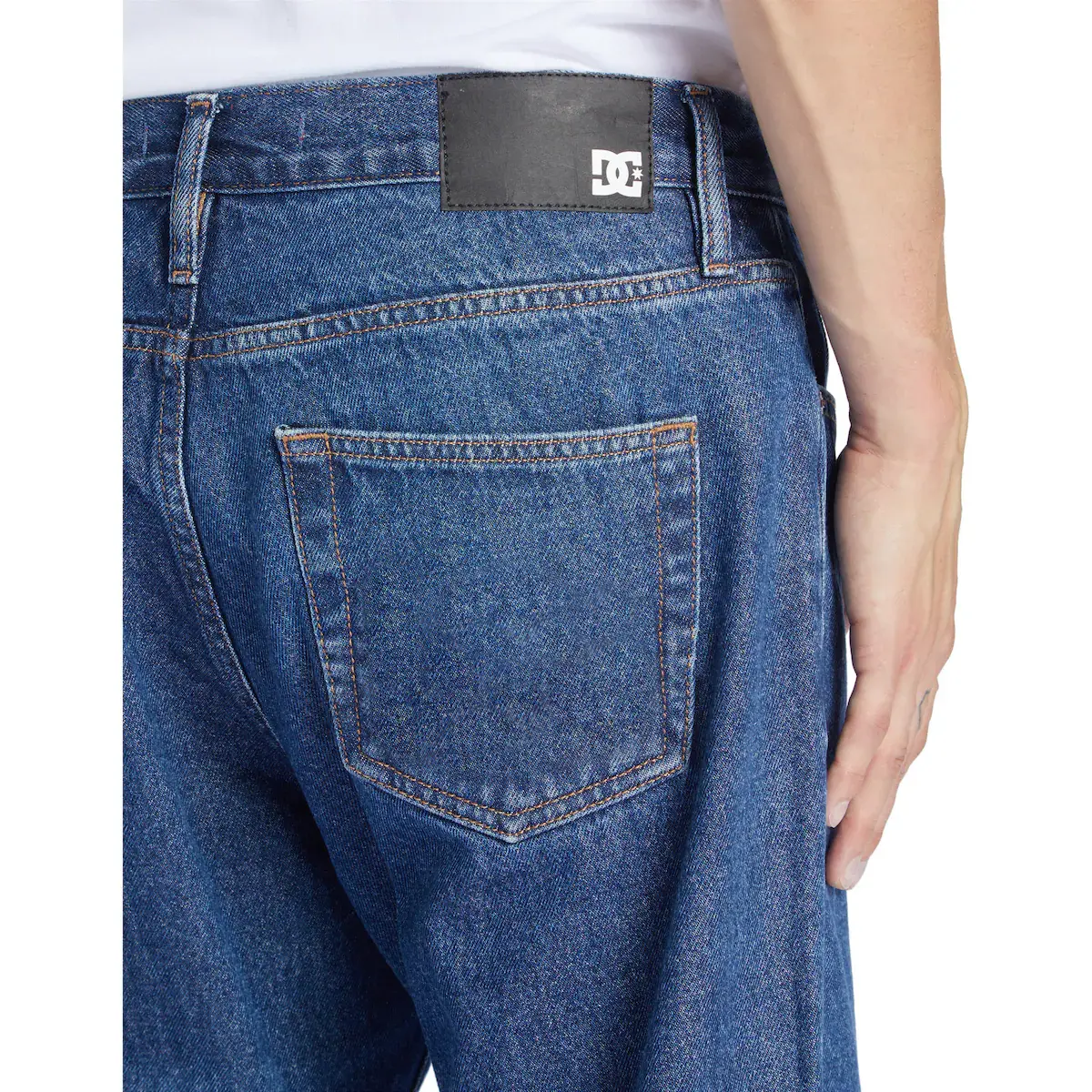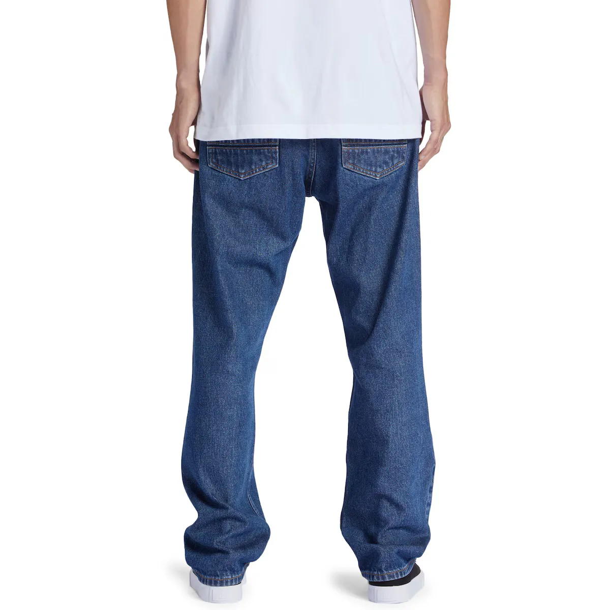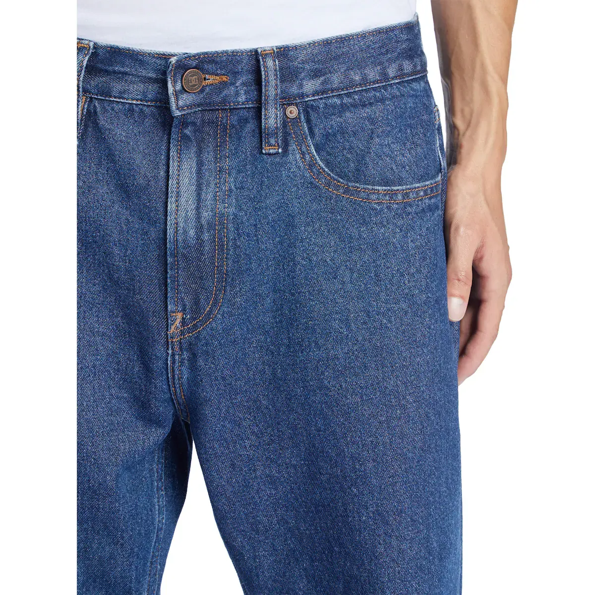 Джинсы свободного кроя для мужчин. Характеристики включают: Ткань жесткий и удобный джинсовый материал, изготовленный из переработанного хлопка [340 г/м2], Свободный крой, Застежка: молния, Обычная талия, Застежка: на пуговицу, пять карманов, Ширина штанины: 40,6 см, Другие характеристики: стиль заниженной талии, Свободный в области бедер и бедер, Металлические украшения, Вышивка на внутренней стороне молнии, Конусообразная форма штанин от колена до подола, Низкий уровень воздействия EIM, Стирка с низким потреблением воды.