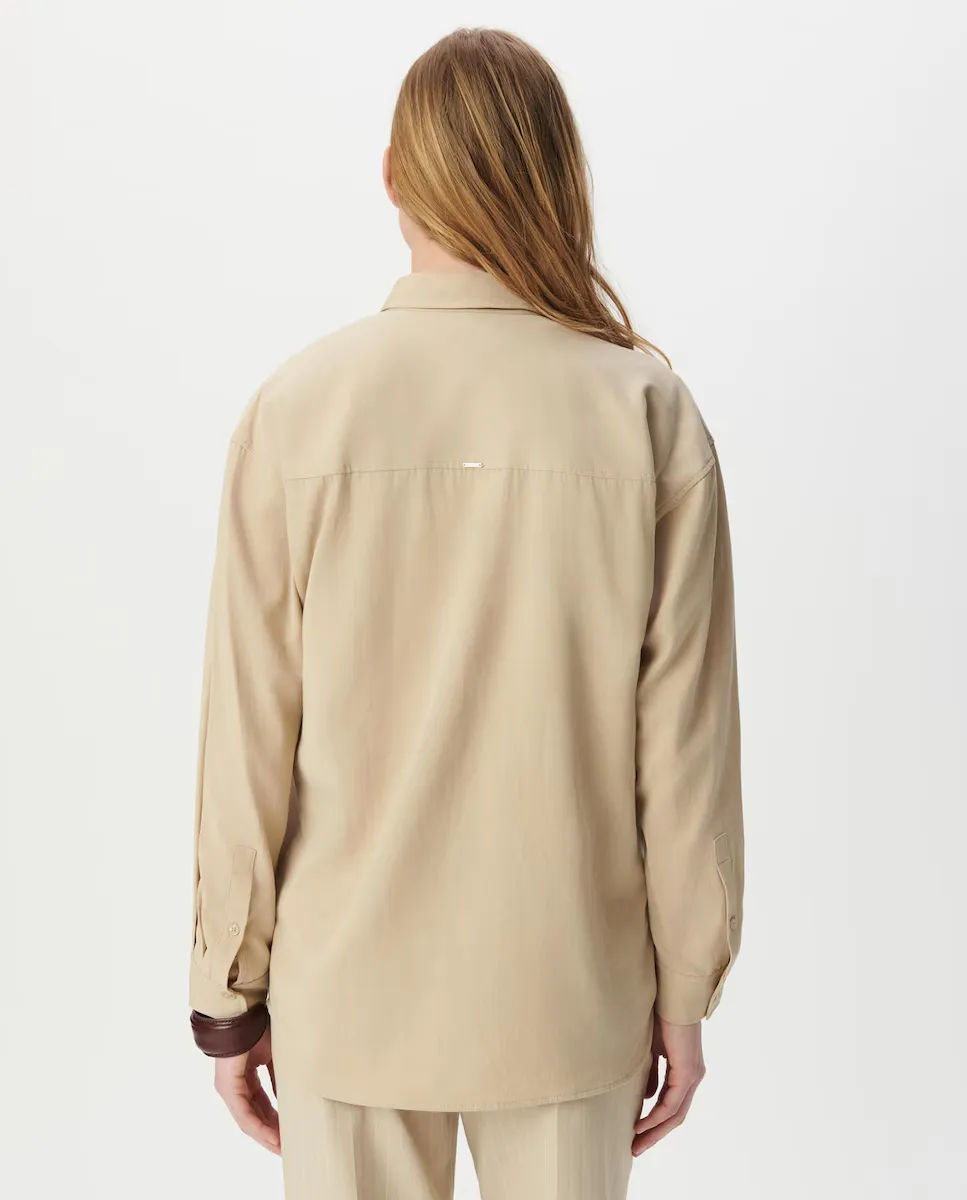Женская рубашка из лиоцелла, хлопка и льна песочного цвета. Воротник-стойка, длинные рукава с застежкой на пуговицы. Два больших кармана на груди с клапаном. Застежка на пуговицы. Оверсайз крой.